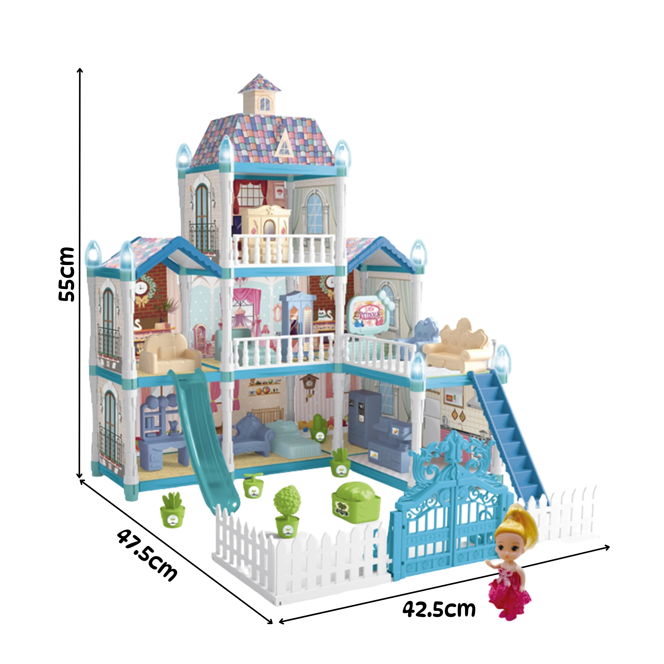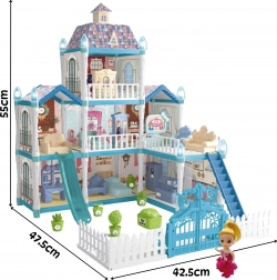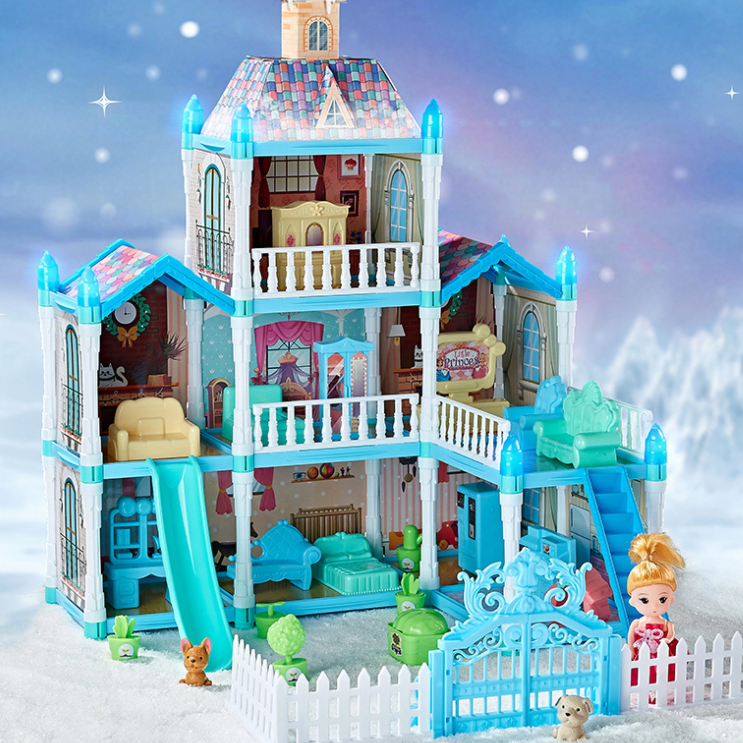 Tento priestranný, trojúrovňový palác pre bábiky prináša deťom hodiny kreatívnej zábavy. Vďaka 191 prvkom môžu navrhovať interiér, starať sa o bábiku a jej zvieracích kamarátov a užívať si podsvietené dekorácie, ktoré rozžiaria hru aj po zotmení. Modro‑ružová estetika navodzuje atmosféru zimného zámku a záhrady.