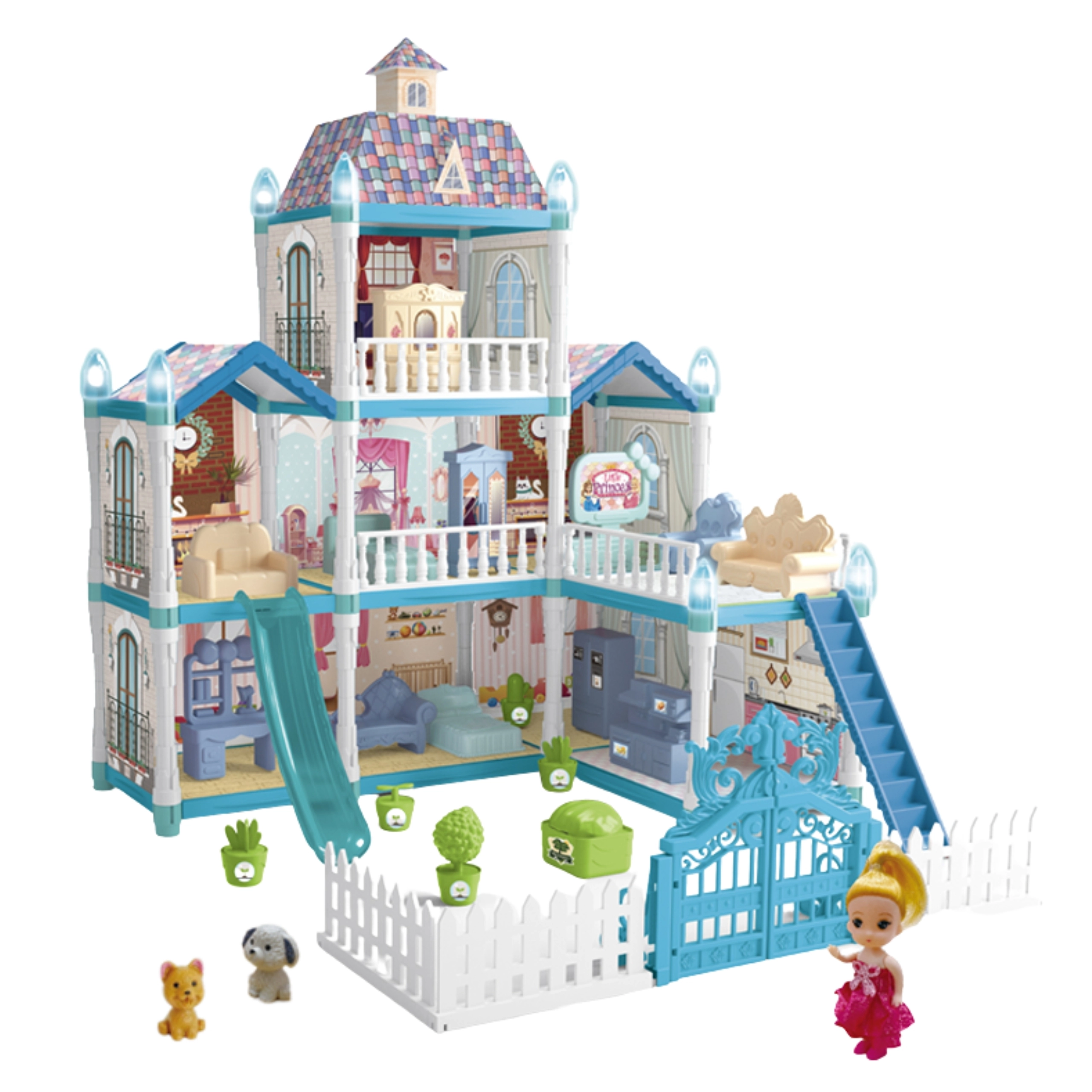- Domček, bábika, 2 zvieratká (pes, mačka), nábytok a záhradné doplnky, svetelné dekorácie