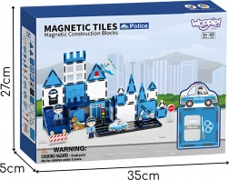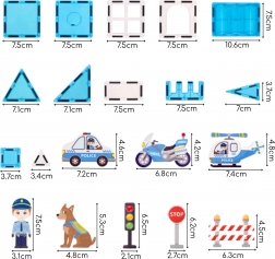 - Magnetické panely rôznych tvarov, figúrky policajtov, policajný pes, rádiovoz, helikoptéra, motocykel, dopravné značky, bariéry, samolepky