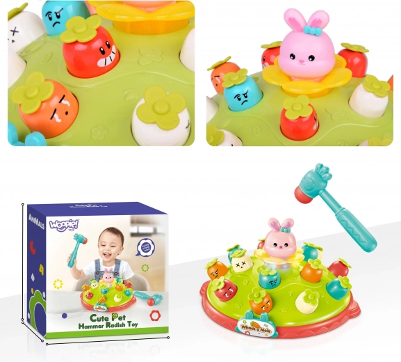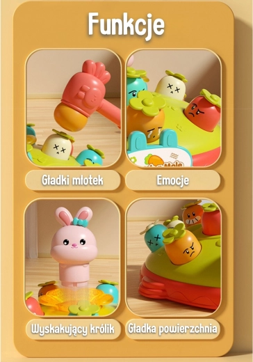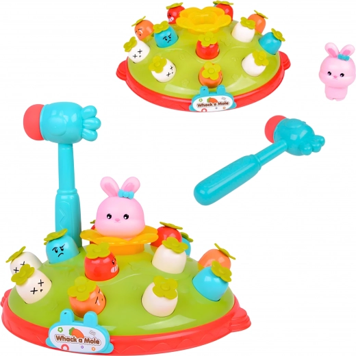 Zábavná a bezpečná interaktívna hra od značky WOOPIE prináša deťom od 18 mesiacov hodiny radosti aj učenia. Deti udierajú mäkkým kladivkom do „krtkov“ a zlepšujú tak reflexy, koordináciu oko–ruka a sústredenie. Farebné svetielka, veselé melódie a priateľský dizajn s mrkvičkami a zajačikmi zvyšujú motiváciu k hre. Hra je vyrobená z kvalitných materiálov, má hladké hrany a mäkké kladivko pre maximálnu bezpečnosť malých rúčok.
