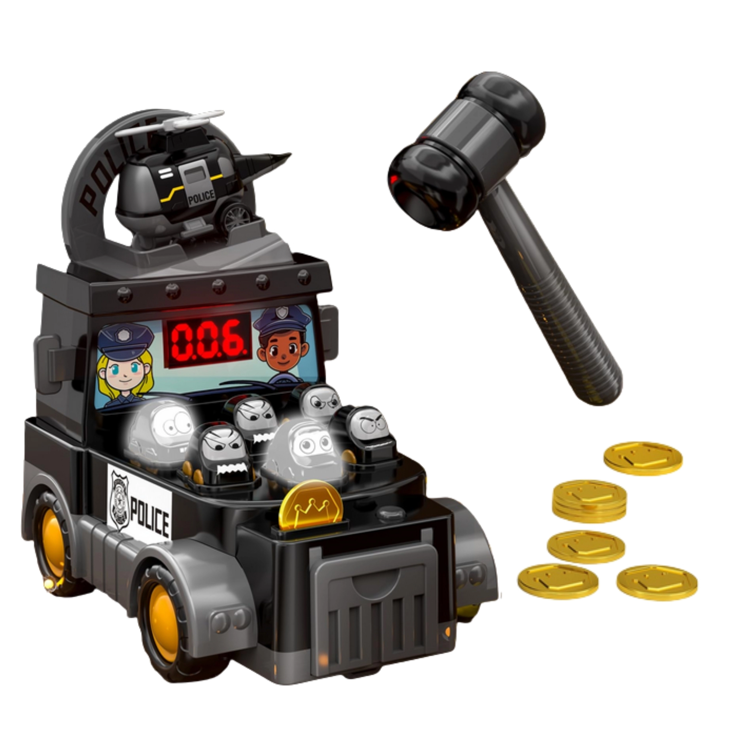 Policajná verzia obľúbenej hry Udri krtka nadchne deti od 3 rokov. Stačí vziať do ruky mäkké kladivko a triafať sa do „záporákov“, ktorí vyskočia z otvorov v rádiovozidle. Vďaka displeju so skóre deti ľahko sledujú svoj výkon a môžu súperiť s kamarátmi či rodičmi.