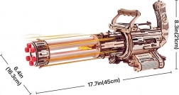 Model sa skladá zo 412 presne vyrezaných drevených dielikov a zostavíte ho bez použitia lepidla. Predná spúšť zabezpečuje rotáciu hlavní, horná spúšť uvoľňuje streľbu – dvojitá akcia pre dvojnásobnú zábavu. Po dokončení získate výrazný dekoračný prvok, ktorý vynikne v každej zbierke technických a filmových replík.