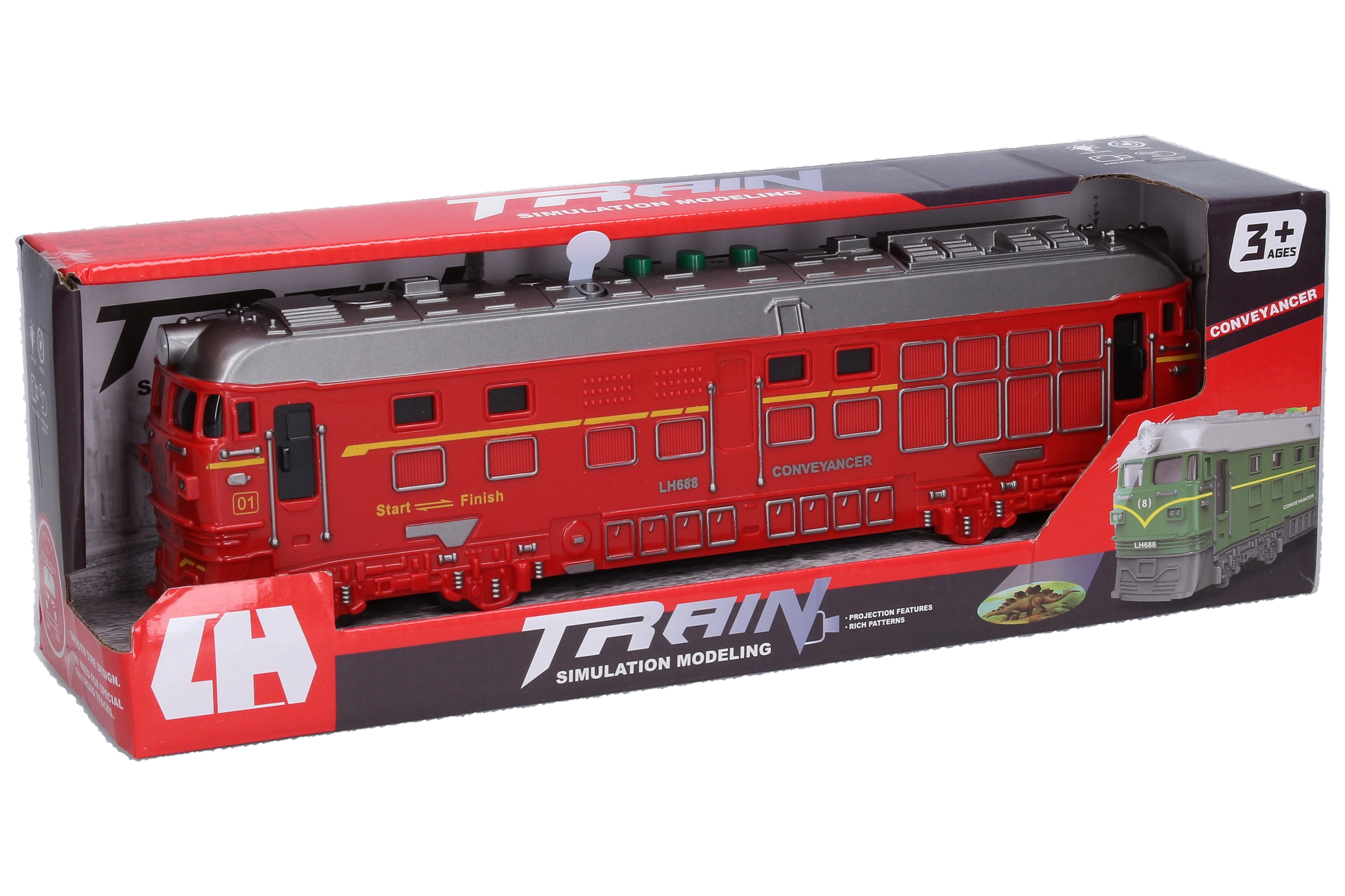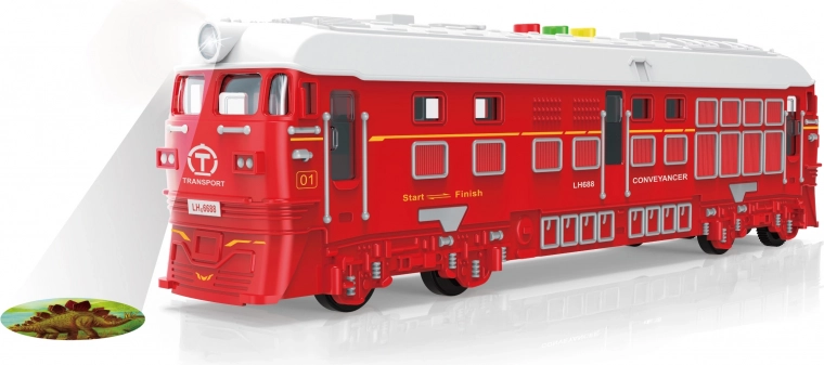 Tento červený vlak na zotrvačník s dĺžkou 33 cm prináša deťom realistický zážitok z jazdy. Vďaka svetelným a zvukovým efektom a zabudovanej projekcii je hra ešte pútavejšia. Ovládanie je jednoduché – stačí stlačiť tlačidlá na streche a užiť si zvuky vlaku a železnice.