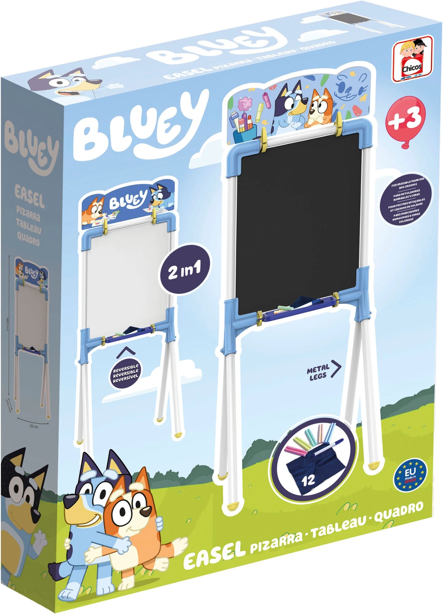 Táto obojstranná tabuľa BLUEY 2v1 rozvíja detskú kreativitu a učenie hrou. Ponúka bielu stierateľnú plochu pre fixku a čiernu kriedovú plochu – deti tak môžu jednoducho striedať písanie, kreslenie aj počítanie. Veselý motív BLUEY zaujme a podporí fantáziu aj sústredenie.