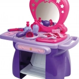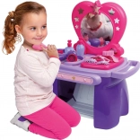 Súčasťou je 12 tematických doplnkov – flakóniky, hrebeň, kefa, detský fén, čelenka a sponky – ktoré podporujú kreatívnu hru a rozvoj jemnej motoriky. Vďaka rozmerom 54 × 58 × 30 cm sa stolík hodí do väčšiny detských izieb a ponúka bezpečné a odolné plastové prevedenie na každodenné hranie.