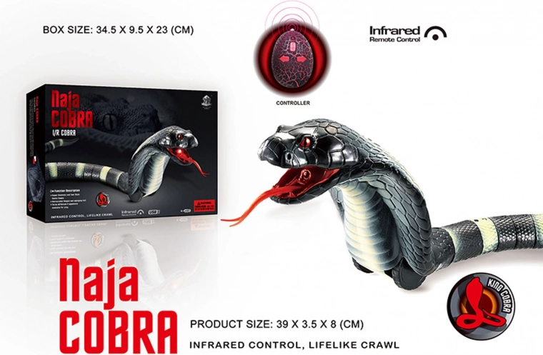 Realistický RC had COBRA pre deti od 6 rokov zaujme svojím prirodzeným pohybom a efektmi. Pohybuje sa v troch smeroch (vpred, vpravo, vľavo), plazí sa ako skutočný had, vyplazuje jazyk a má podsvietenú tlamu. Chvost z 21 segmentov zabezpečuje plynulý a rýchly pohyb. Ovládanie na frekvencii 2,4 GHz pomocou diaľkového ovládača v tvare vajíčka. Nabíjateľný akumulátor 3,7 V je súčasťou balenia, rovnako ako batérie do ovládača.