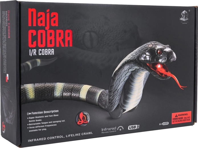RC had COBRA je efektná hračka, ktorá zaujme realistickým vzhľadom aj pohybom. Segmentovaný chvost (21 dielov) zaisťuje plynulé „vlnienie“ a rýchle manévre, zatiaľ čo pohyblivý jazyk a LED svetlo v tlame dodávajú hre dramatický nádych. Ovládanie na frekvencii 2,4 GHz je stabilné a ľahko zvládnuteľné aj pre deti.