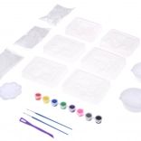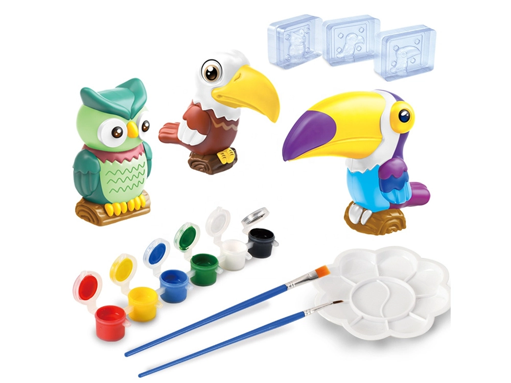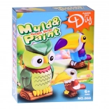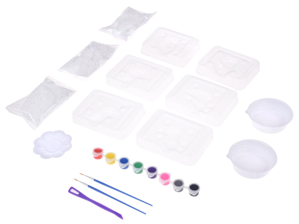 - 3 vrecúška sadry, priehľadné formy na vtáky, 2 odmerky, paleta na miešanie, 8 akrylových farieb, 2 štetce, plastový nástroj/nožík