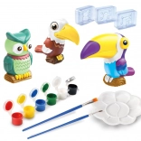 Súčasťou sú pestré farby, 2 štetce a kvetinová paleta na miešanie odtieňov. Deti môžu kombinovať farby a tvoriť originálne vzory na svojich vtákoch z džungle.