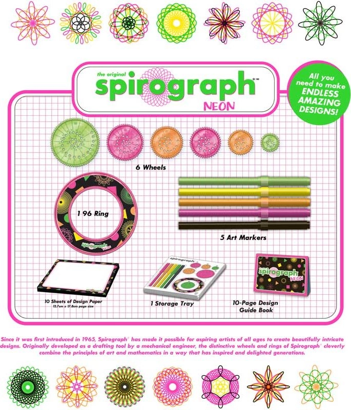 So sadou Spirograf Neon deti ľahko vykúzlia presné geometrické vzory, špirály a mandaly, ktoré môžu následne vymaľovať. Sada je navrhnutá tak, aby rozvíjala kreativitu, kombinačné schopnosti a jemnú motoriku zábavnou formou.
