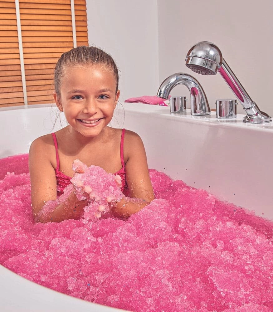 Stačí nasypať prášok do vane a počas chvíľky získate ružové, trblietavé želé, ktoré deti milujú. Zmyslová hra, ktorá podporuje kreativitu a jemnú motoriku.