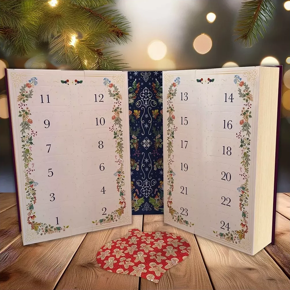 Elegantný „book-style“ kalendár s bohatou vianočnou grafikou a 24 perforovanými dvierkami pre každodenné prekvapenie.