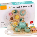 Súčasťou je všetko, čo deti potrebujú na realistickú hru – kanvička, šálky, podšálky, tácka, lyžičky, mištička na mlieko, citrón, sušienky aj čajové vrecúško. Spolu 15 prvkov podporuje jemnú motoriku, komunikáciu a napodobňovanie dospelých.