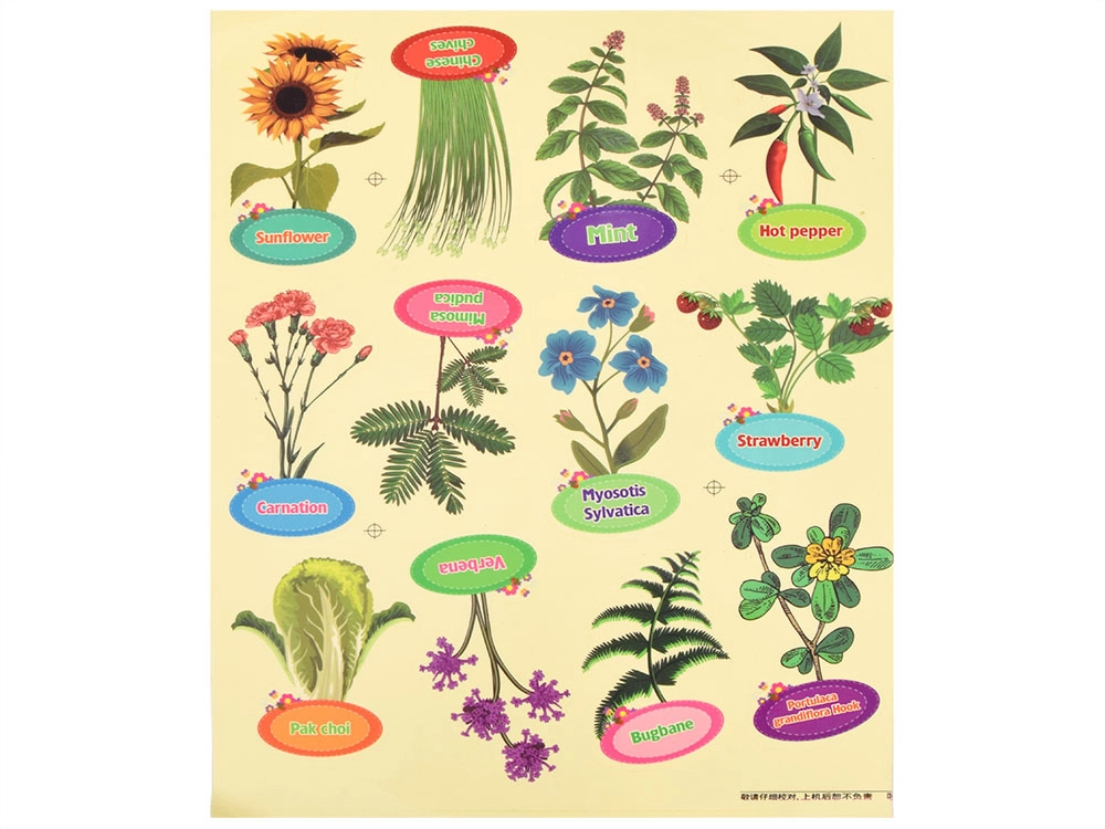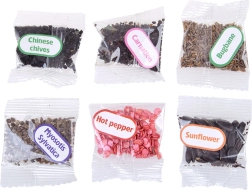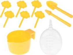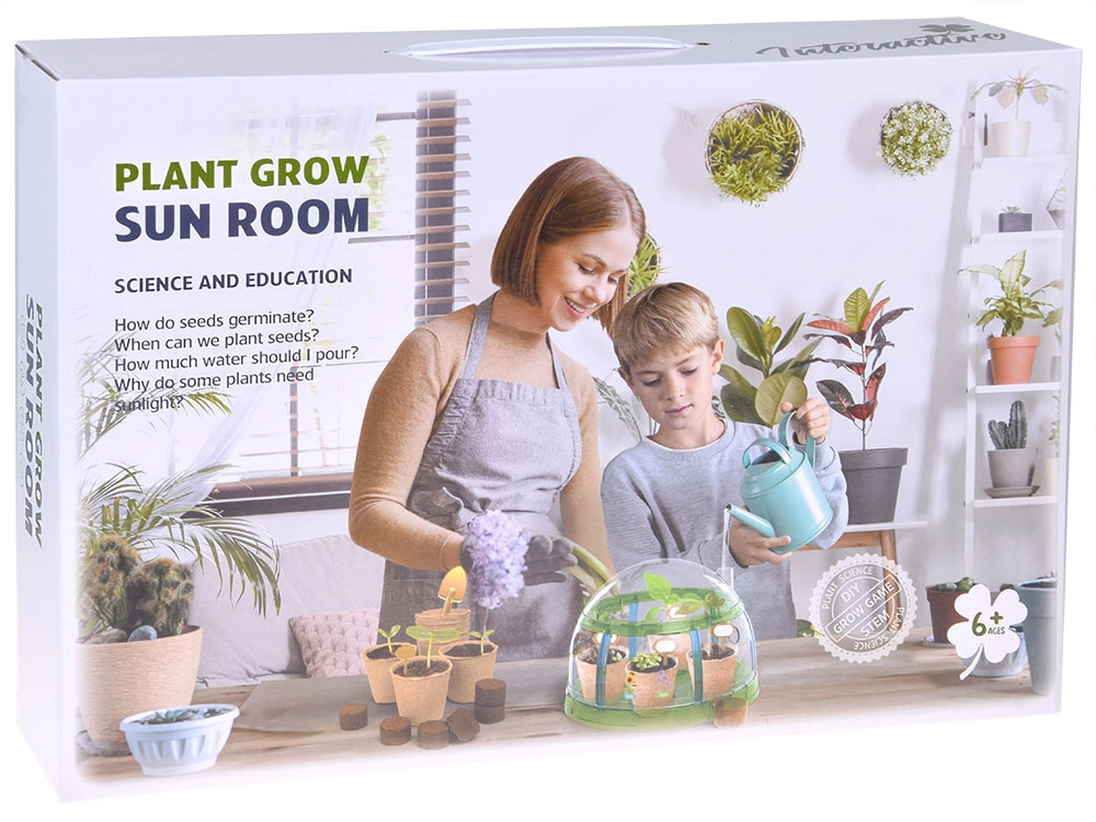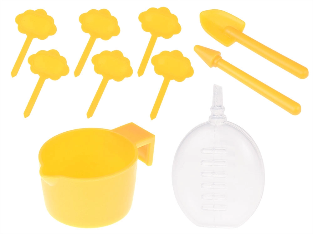 - 1× mini skleník, 6× biodegradovateľný kvetináčik, 6× kokosová briketa (Ø 30 mm), 6× štítok na označenie rastlín, 1× lopatka, 1× sadbovacia špica, 1× kelímok na zalievanie, 1× sada samolepiek (s názvami a obrázkami rastlín), 1× sada samolepiek s názvami rastlín (v angličtine), 6× sáčok so semienkami (netýkavka, slnečnica, trvalka, pažítka, klinček, paprika), obrázkový návod