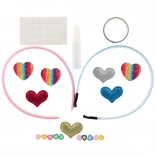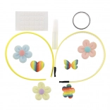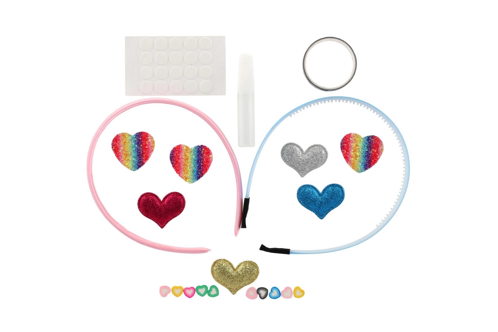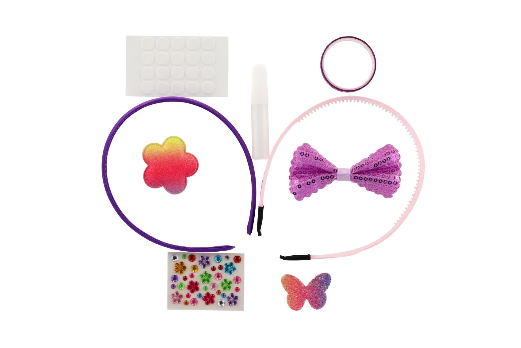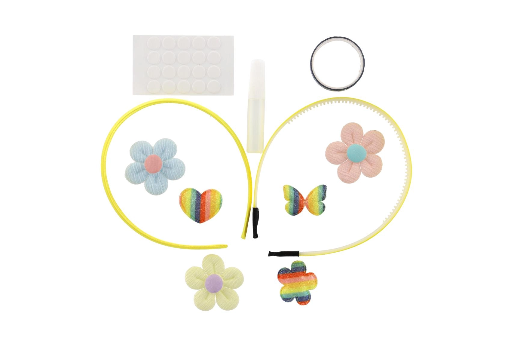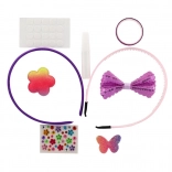 - 2 plastové čelenky, mix dekorácií (aplikácie motýľ, srdce, kvet, kamienky), samolepiace bodky, malé lepidlo; niektoré sady môžu obsahovať stuhu/šnúrku či krúžok