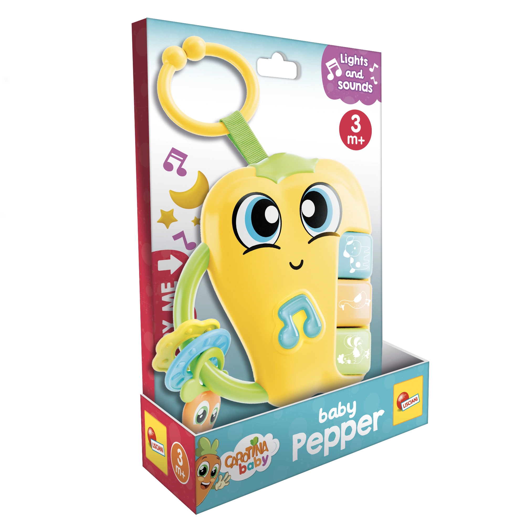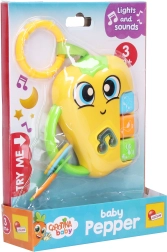 Zábavná hračka pre najmenších Carotina paprička s efektmi ponúka svetelné a zvukové podnety, ktoré podporujú zmyslový rozvoj. Deti zaujmú 3 tlačidlá so zvieratkami s melódiami a zvukmi, tlačidlo s notou s 2 melódiami a blikaním a praktický krúžok na zavesenie. Batérie sú súčasťou balenia, takže zábava môže začať hneď.