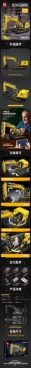 Táto kvalitná konštrukčná stavebnica poteší všetkých fanúšikov techniky. Z dielikov postavíte detailný bager s robustnou, odolnou plastovou konštrukciou, ktorý sa pohybije dopredu aj dozadu, zatáča doprava aj doľava a vďaka gumovým pásom zvláda rôzny povrch. Ovládanie prebieha duálnym režimom – buď cez 2,4 GHz diaľkový ovládač, alebo cez mobilnú aplikáciu (QR kód je na balení). V aplikácii možno navyše programovať pohyby a tvoriť vlastné sekvencie.