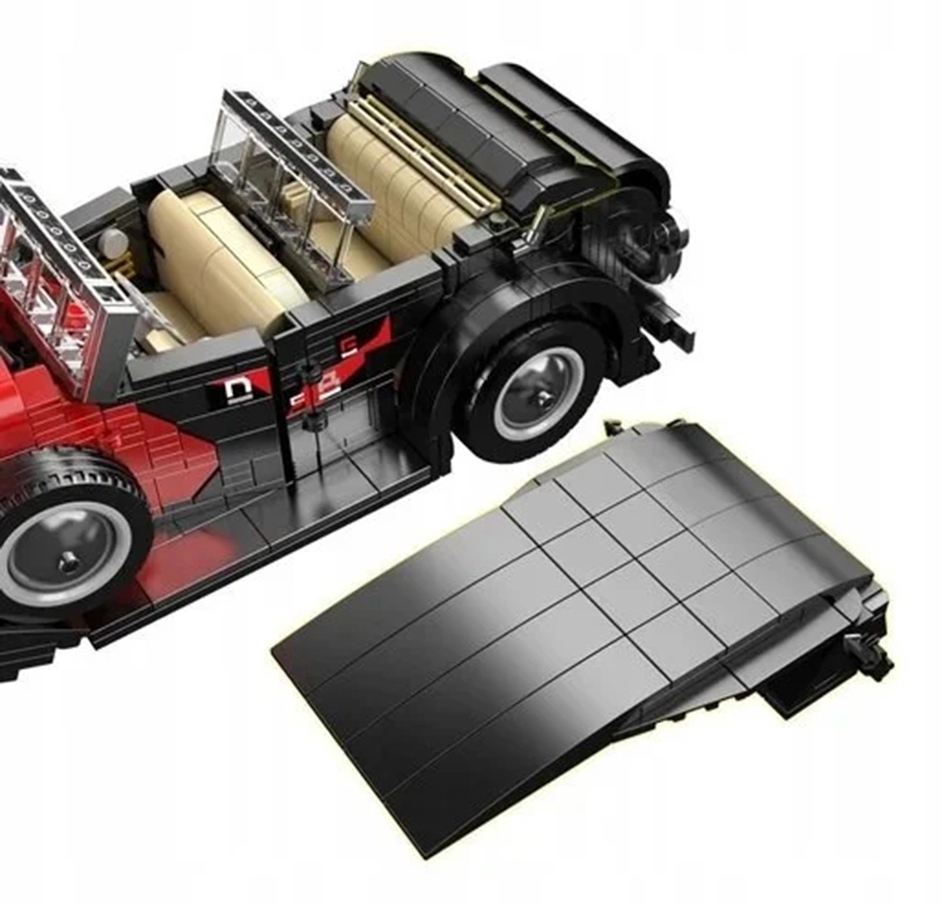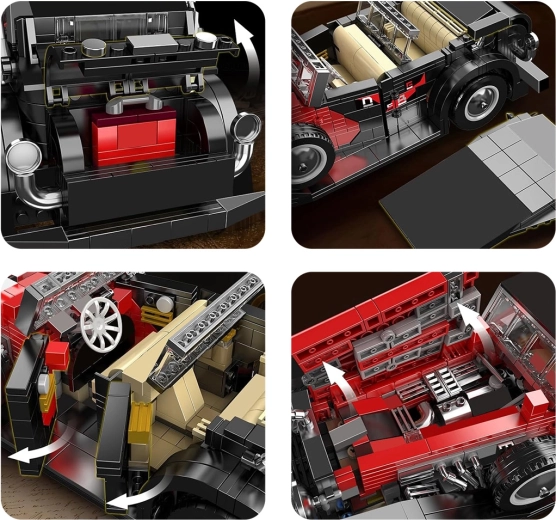 Tento detailný model historického vozidla v elegantnej čierno‑červenej kombinácii poteší každého milovníka klasických áut aj stavebníc. Robustná konštrukcia, verná silueta a premyslené prvky interiéru aj exteriéru zaručujú atraktívnu stavbu aj pôsobivý výstavný kúsok.