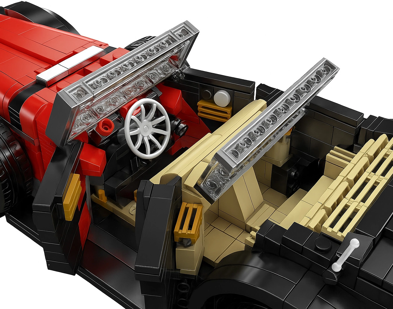 Vďaka odnímateľnej streche ľahko premeníte kupé na kabriolet, otváracie dvere a kapota motora odhalia ďalšie realistické detaily. Gumové pneumatiky, výrazné blatníky a svetlá podčiarkujú autentický vzhľad. Stavebnica je vhodná pre staršie deti a dospelých, ktorí ocenia spojenie zábavy zo stavanía dekoratívnej hodnoty hotového modelu.