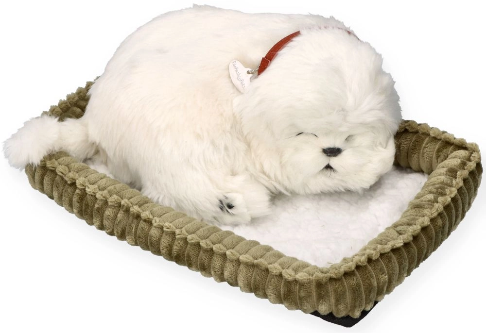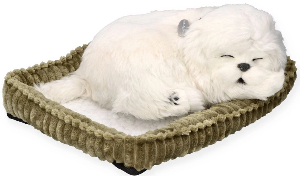 Maltézáčik v prirodzenej spiacej polohe pôsobí vierohodne a prináša pokojnú atmosféru do detskej izby aj obývačky.