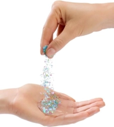 Vytvor si dokonalý trblietavý efekt vďaka priehľadnému slizu a štyrom druhom trblietok. Miešaj, kombinuj a prispôsob si vzhľad bábiky na každý deň.