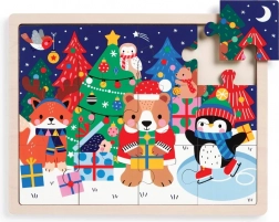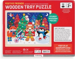 Detské drevené puzzle MUDPuppy prináša čarovnú sviatočnú atmosféru s motívom veselých zvieratiek, darčekov a ozdobených stromčekov. Veľké a príjemne „bacuľaté“ dieliky sa ľahko držia malými rúčkami a skladajú sa priamo do odolného dreveného podnosu, takže sa žiadny dielik nestratí.