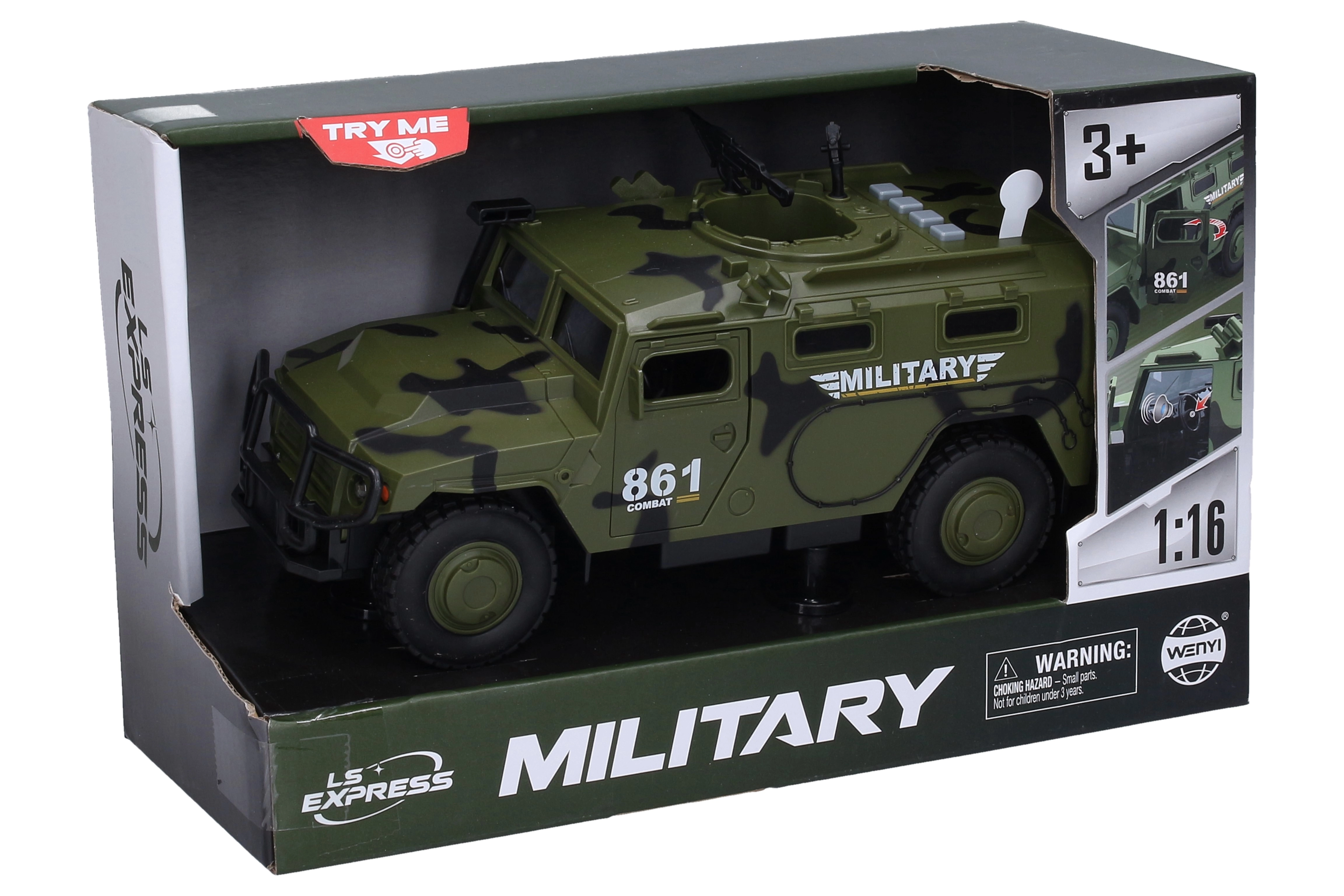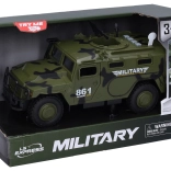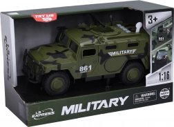 Realistické vojenské auto na zotrvačník ponúka svetelné a zvukové efekty, otváracie predné dvere a pevné prevedenie s dĺžkou 25,5 cm. Jednoduché ovládanie pomocou tlačidiel na streche, batérie sú súčasťou balenia.