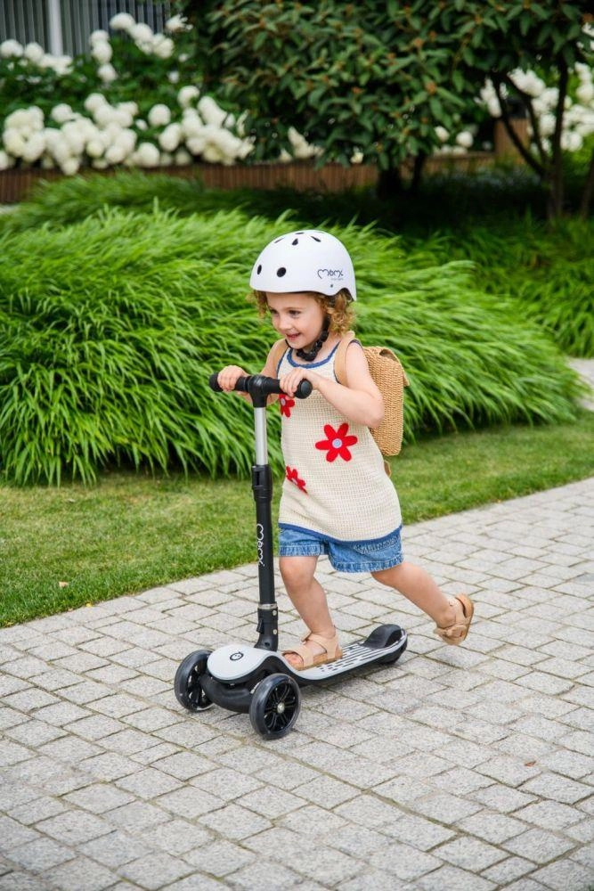 MoMi SAN je ideálna prvá kolobežka pre malých jazdcov. Tri kolesá zabezpečujú výbornú stabilitu, nízka a široká nášľapná plocha zas bezpečné naskočenie aj zoskočenie. Svietiace LED kolieska potešia deti a zároveň zlepšia viditeľnosť pri jazde.