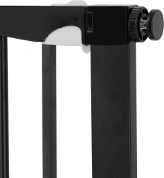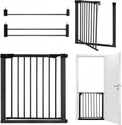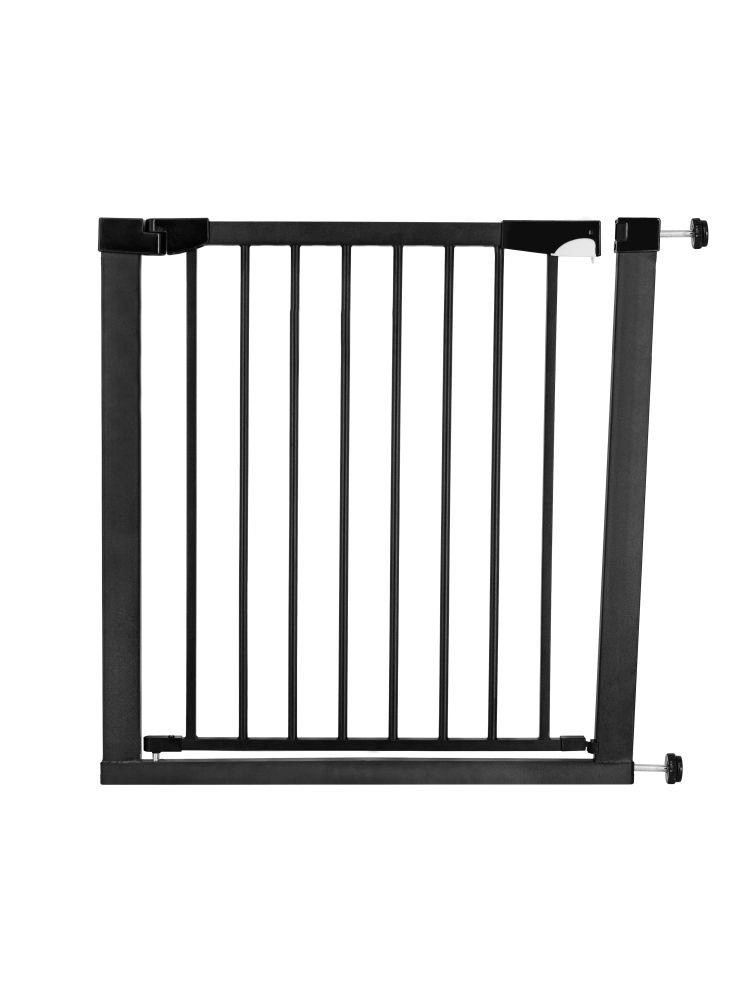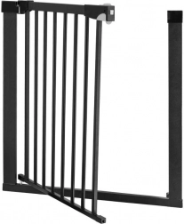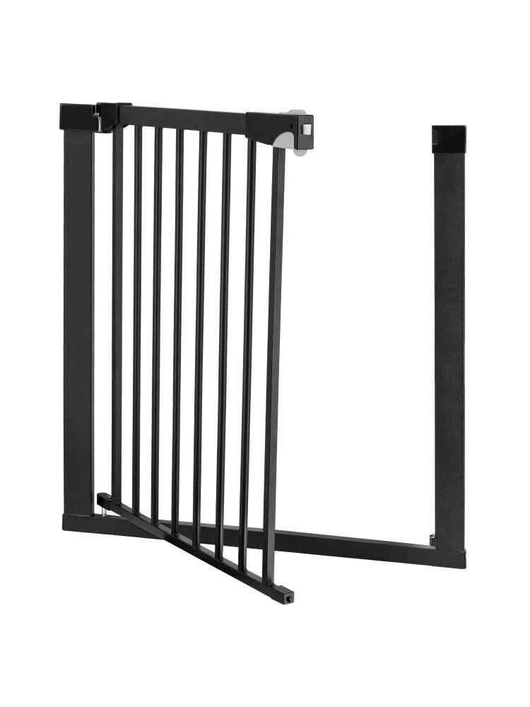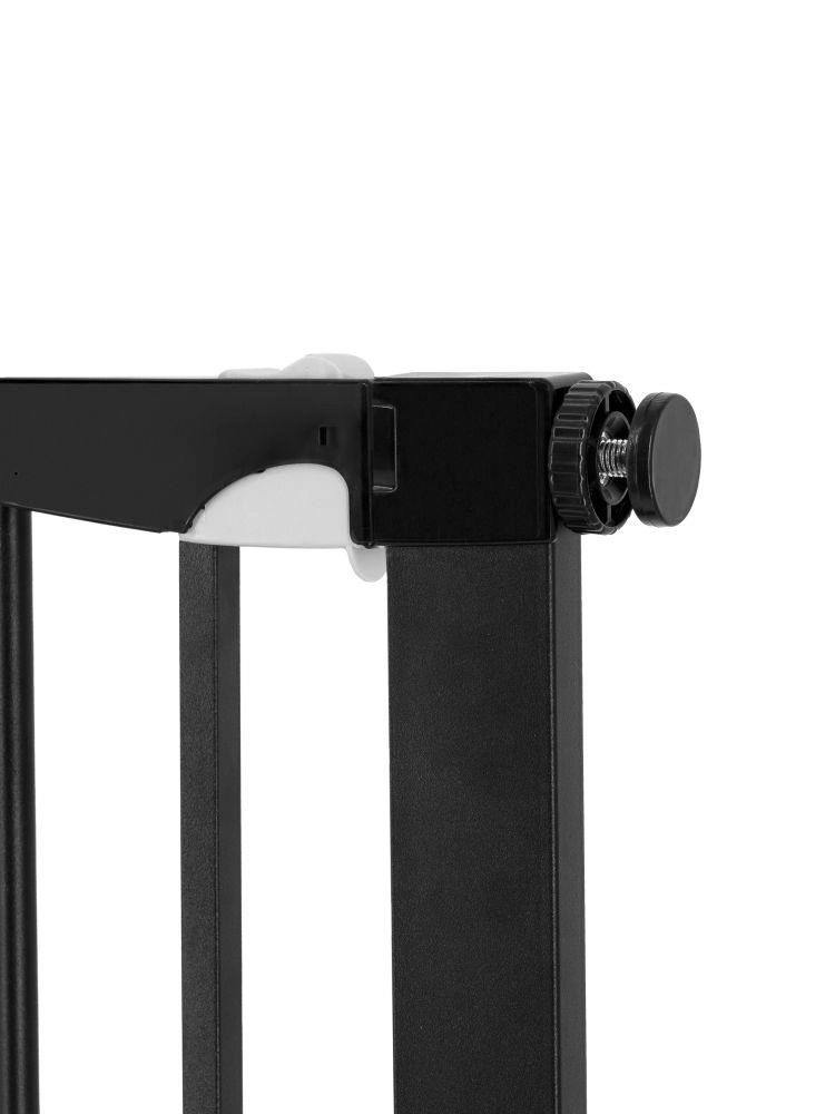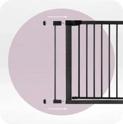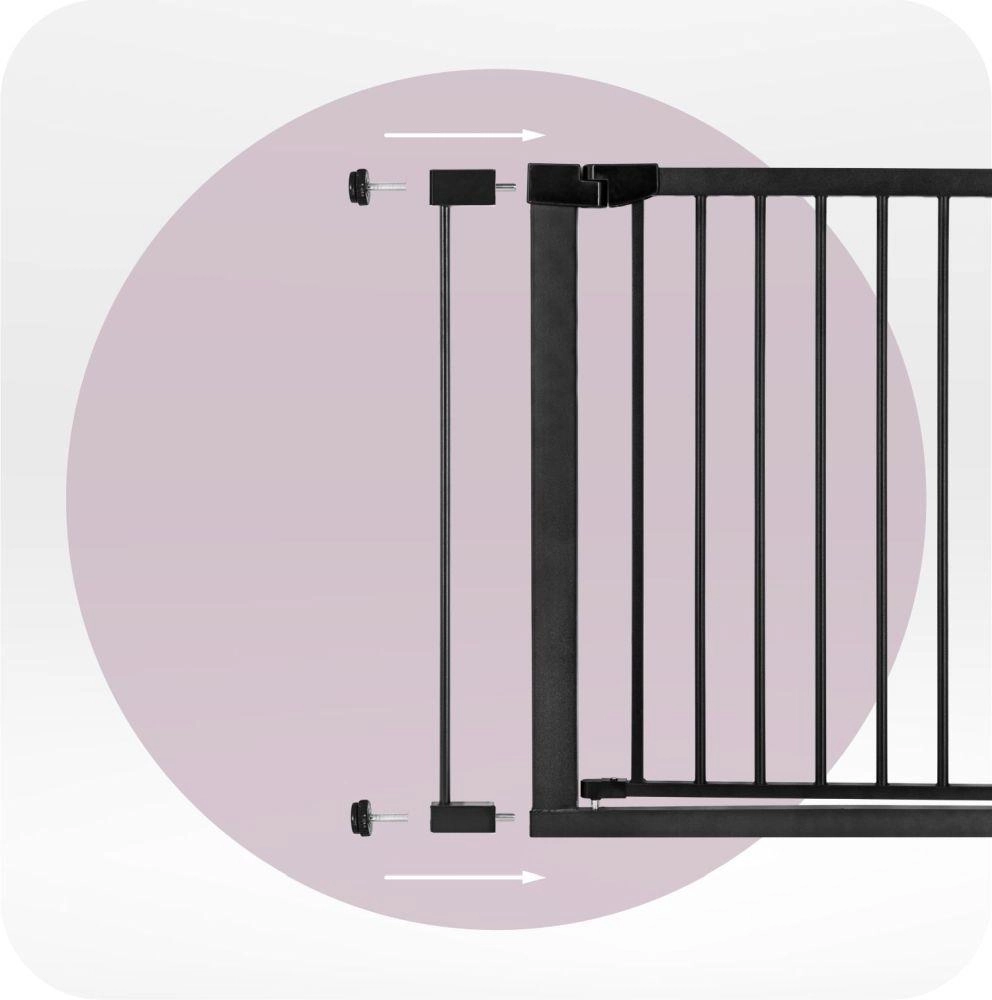 Základná šírka 75–82 cm a priložené nadstavce 7 cm a 14 cm umožnia rozšírenie až na 103 cm. Zábrana sa otvára oboma smermi, má praktické zaistenie a pri otvorení na 90° zostane dokorán pre pohodlný prechod. Dvojitý uzamykací systém znemožňuje deťom bránu samostatne otvoriť.