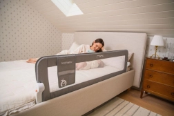 Inštalácia je rýchla a variabilná: zábranu môžete priskrutkovať ku konštrukcii postele alebo ju zasunúť pod matrac a stiahnuť zaisťovacími popruhmi (súčasť balenia). Funkcia otvárania o 180° uľahčí každodenné používanie – vstávanie z postele aj sklopenie zábrany, keď ju práve nepotrebujete.
