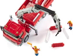 Model ponúka bohaté funkcie: otočný a kĺbový žeriav s hákom, vyklápaciu korbu na nakládku/vykládku a výsuvné stabilizačné podpery pre bezpečné zdvíhanie bremien. Gumové kolesá sa hladko odvaľujú po rôznych povrchoch a doplnky v podobe figúrok a bariér rozširujú možnosti hry a podporujú fantáziu.