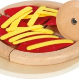 Drevené plátky pizze sa spájajú suchým zipsom a ľahko sa rozdeľujú krájacím kolieskom. Plstené toppingy podporujú fantáziu a neobmedzené kombinácie chutí.
