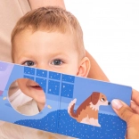 Sada troch obojstranných leporel predstavuje šesť rôznych prostredí (napr. lúka, les, pasienok, voda či domov), v ktorých deti objavia spolu 24 zvieratiek. Vďaka kruhovým okienkam a vkladacím žetónom si deti precvičia priraďovanie zvierat k ich prostrediu a vytváranie vlastných príbehov. Leporelá sú z extra pevného kartónu (2 mm) a majú rozmer 43,5 × 10,5 cm, takže sa dobre držia aj malým deťom.