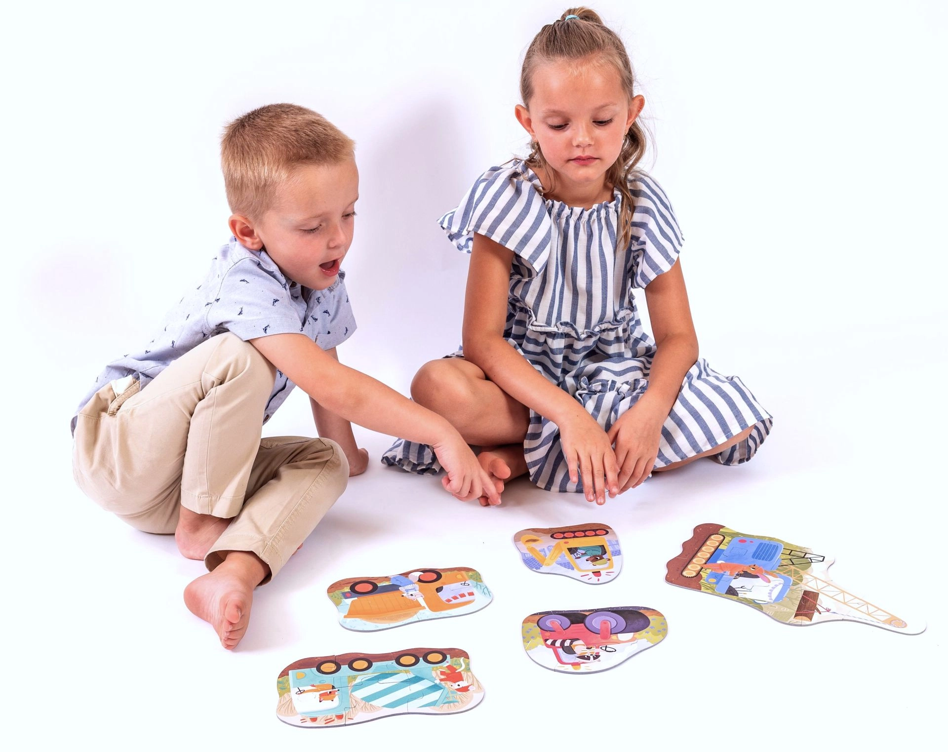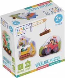 Veselá sada detských puzzle so stavebnými strojmi na prvé skladanie. Obsahuje 5 motívov s rôznou náročnosťou a spolu 24 dielikov. Dieliky sú extra veľké, 2 mm hrubé a z pevného FSC kartónu, takže sa skvelo držia v malých rúčkach. Podporujú jemnú motoriku, logiku a vizuálne vnímanie. Vyrobené v ČR v spolupráci s pedagógmi.