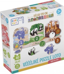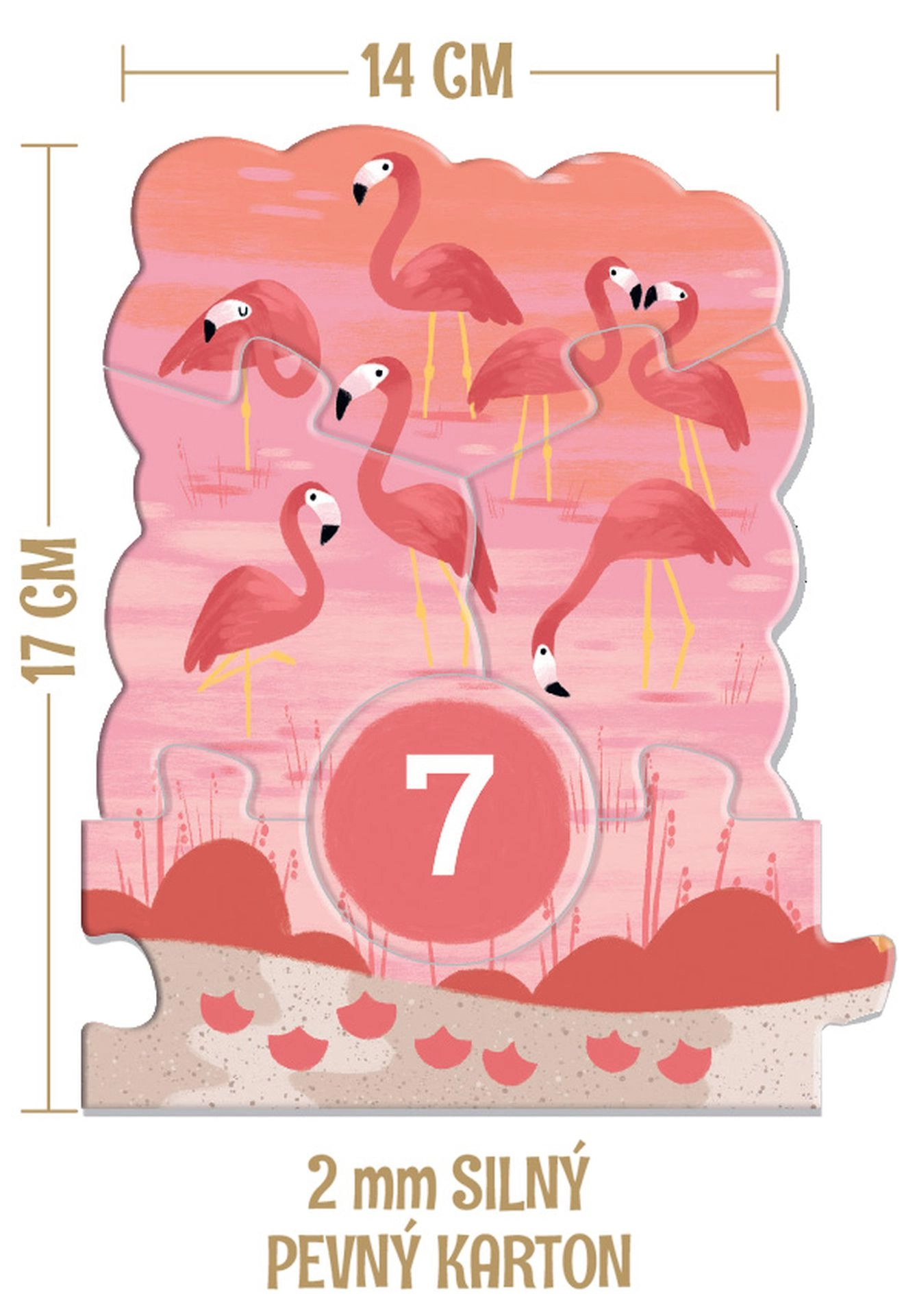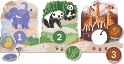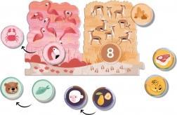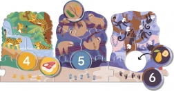 Táto originálna vzdelávacia hra učí deti od 2 rokov spoznávať zvieratá, ich stopy a kŕmenie a zároveň trénuje prvé počítanie od 1 do 10. Dlhé puzzle s výbehmi zvierat deti doplnia o správne žetóny podľa počtu, stopy či potravy a precvičia si tak pozornosť, triedenie a asociácie.