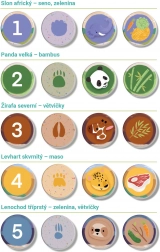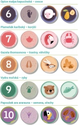 Kruhové žetóny s potravou a zvieracími hlavičkami pomáhajú deťom správne priradiť, čo ktoré zviera je a aké zanecháva stopy.