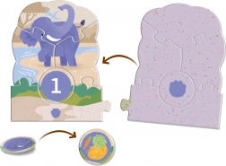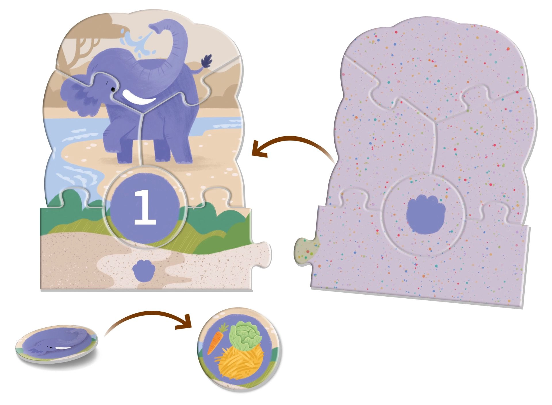 Extra veľké, 2 mm silné kartónové dieliky sa ľahko uchopujú, dobre do seba zapadajú a vydržia aj časté hranie. Súčasťou sú tiež štyri samostatné zvieracie figúrky na voľnú hru a rodičovský sprievodca s nápadmi na herné varianty.