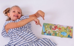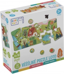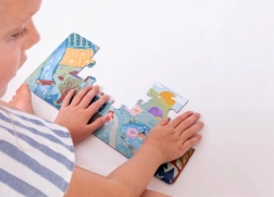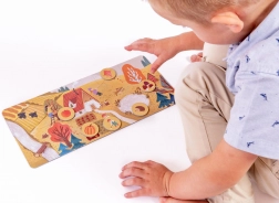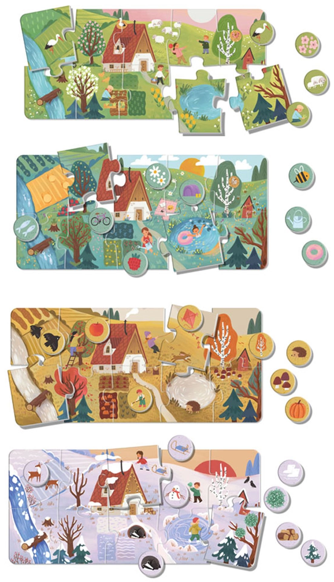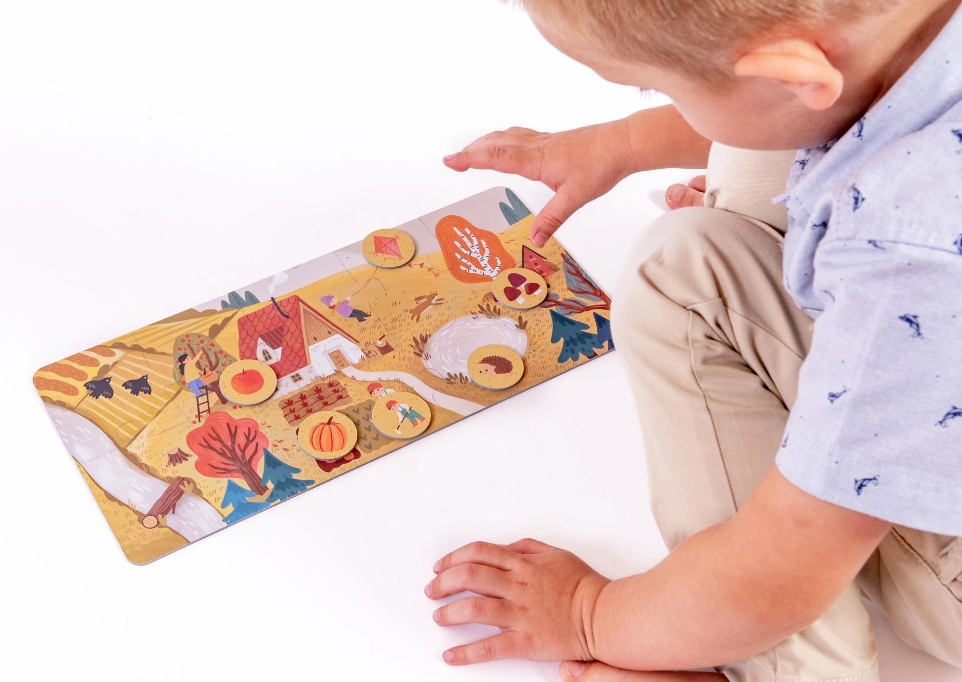 Veľké puzzle loto ročné obdobia KukiKuk prináša deťom štyri krásne scény – jar, leto, jeseň a zimu. Každé obdobie deti poskladajú z 10 veľkých dielikov a následne priraďujú 8 okrúhlych žetónov s typickými motívmi. Vďaka princípom Montessori deti samostatne objavujú, triedia a prepájajú prvky podľa zmyslového vnímania.