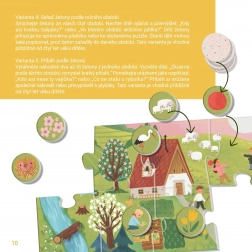 Jar, leto, jeseň a zima v bohato ilustrovaných scénach. Deti spoznávajú zmeny v prírode a bežné činnosti počas roka.