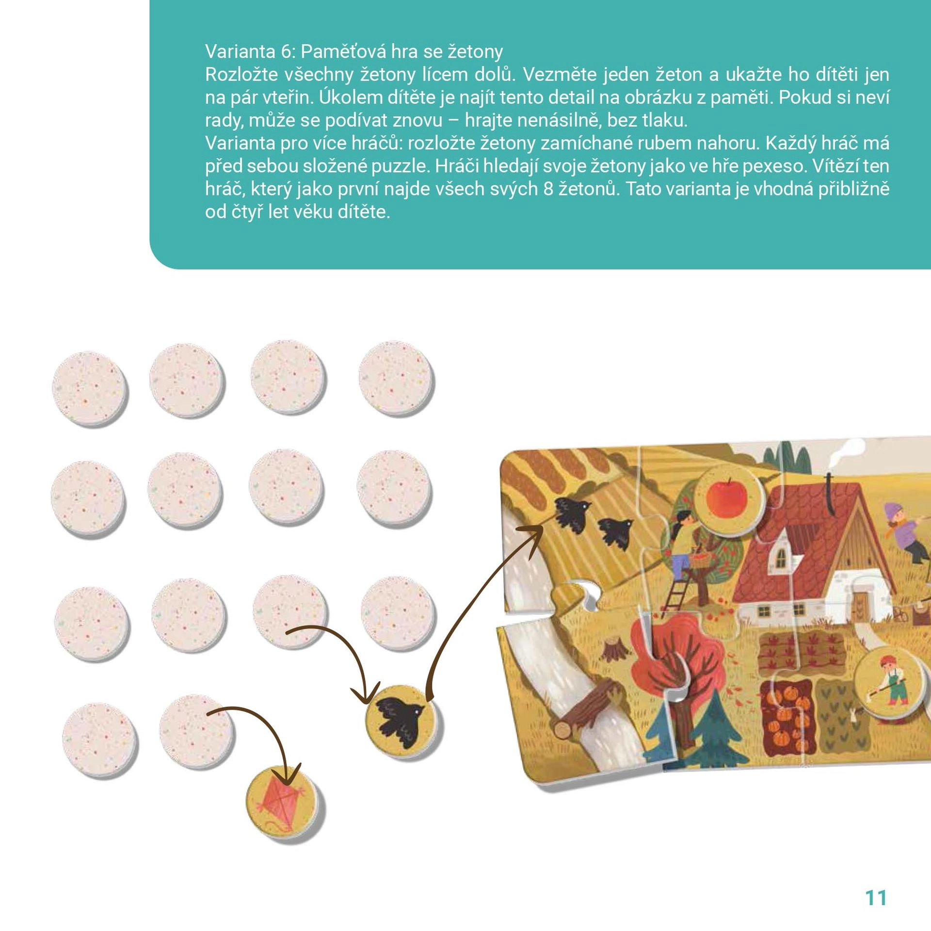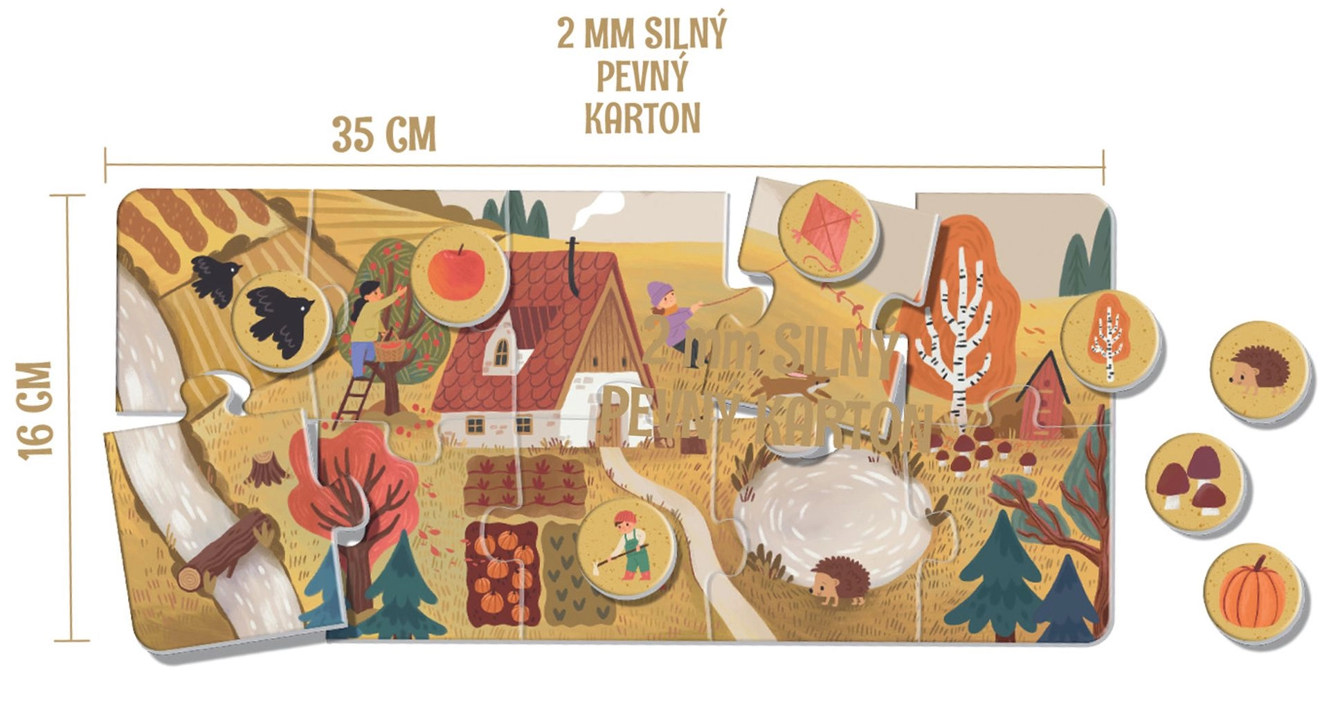 Hra je navrhnutá pre malé rúčky: extra veľké dieliky z 2 mm FSC kartónu sú odolné, ľahko uchopiteľné a úplne bez plastu. Učenie prebieha prirodzene – deti trénujú pozornosť, rozširujú slovnú zásobu a rozprávajú sa o zmenách v prírode počas roka.