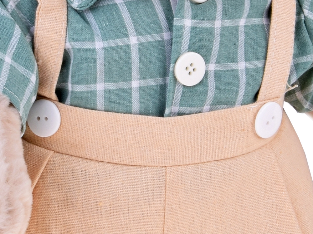 Medvedík Franek kombinuje jemnosť a nadčasový dizajn. Jeho hebký plyš doslova vyzýva k objatiu a decentné vyšívané črty vytvárajú milý, univerzálny výraz. Štýlová zelená košeľa s bielou kockou a svetlé šortky s trakmi dodajú každej izbičke útulnú atmosféru.