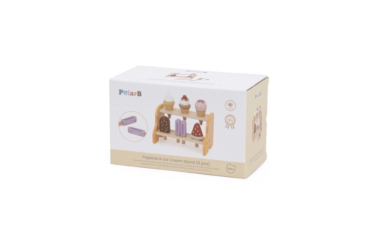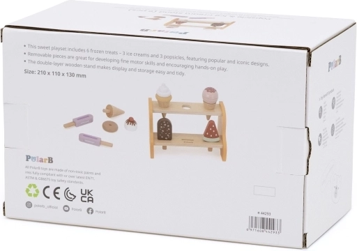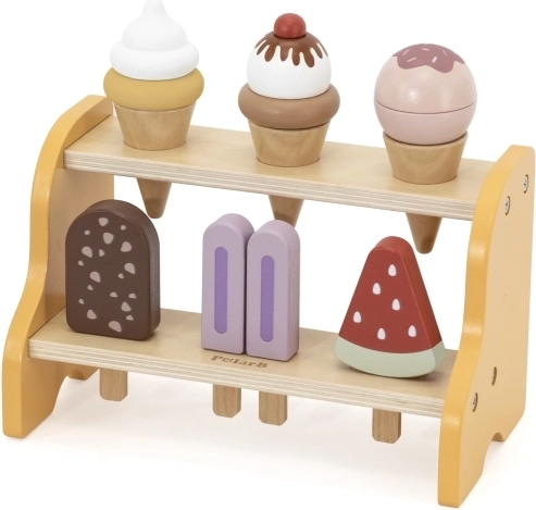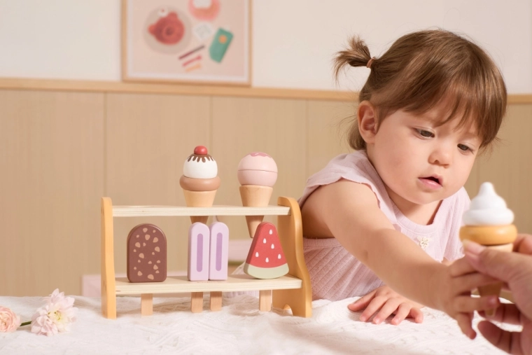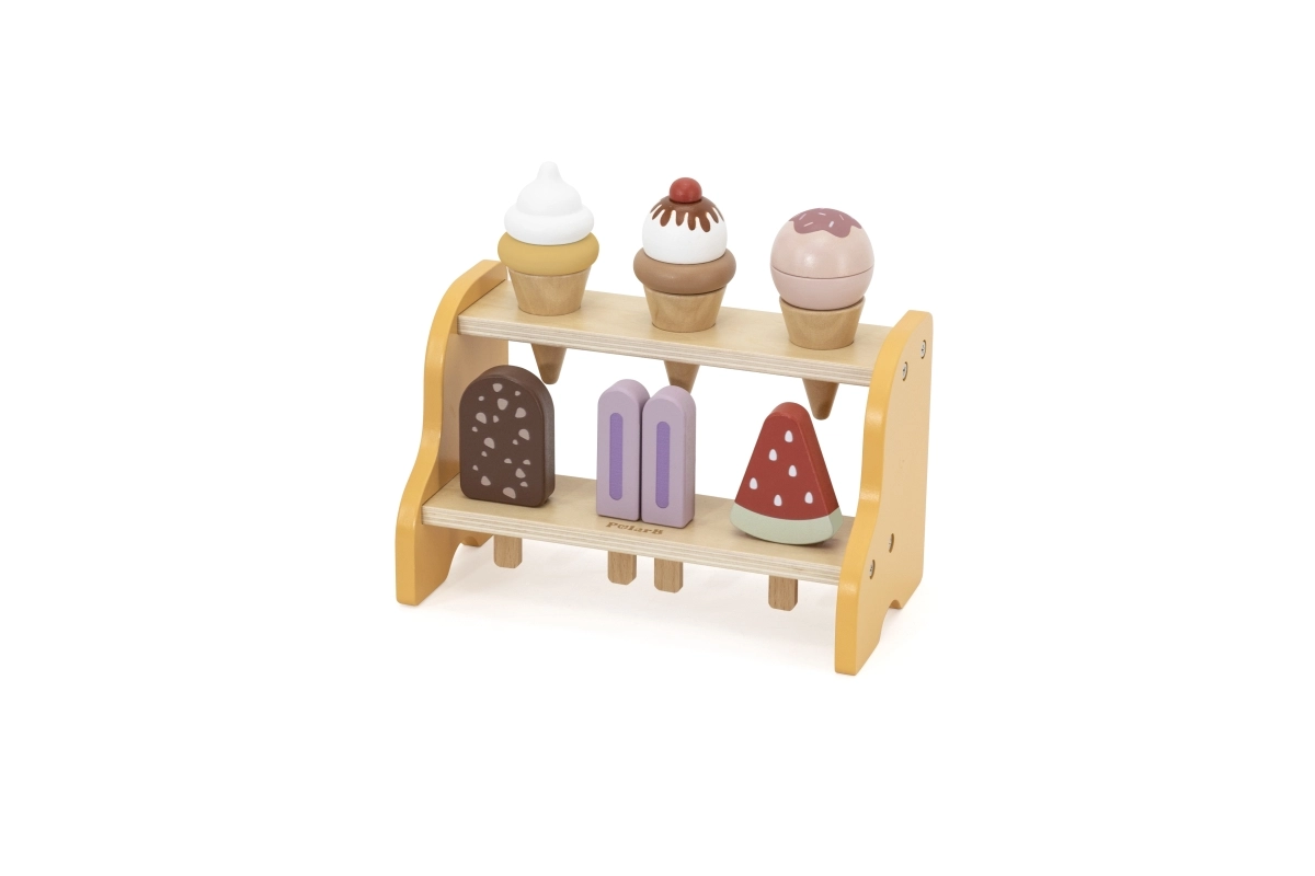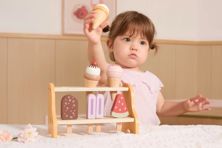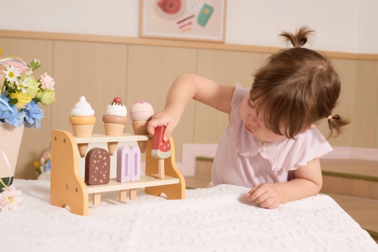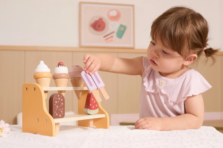 Praktický dvojposchodový stojan udrží všetky kornúty a nanuky na svojom mieste. Deti sa prirodzene učia triediť, ukladať a prezentovať „tovar“ ako v skutočnej zmrzlinárni.