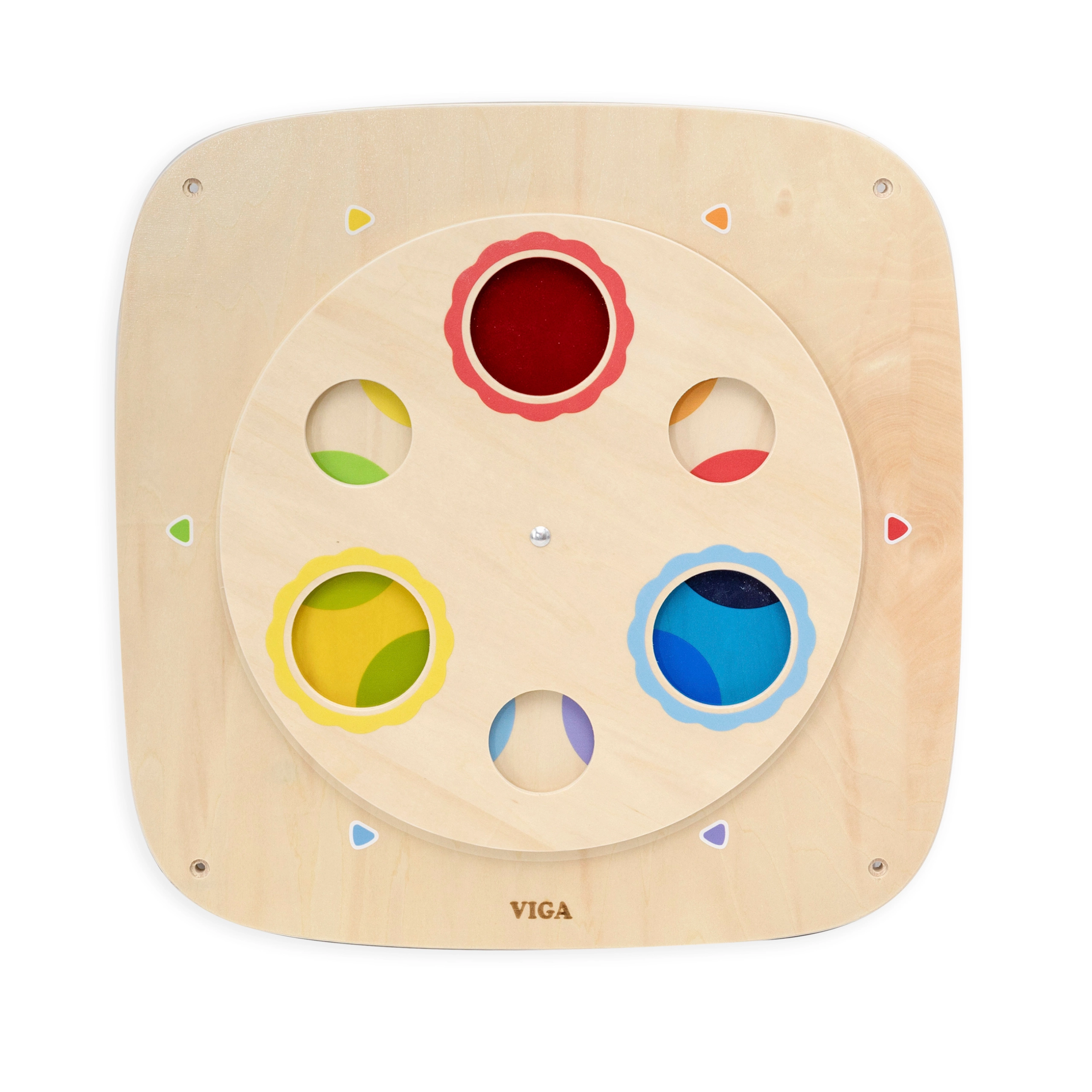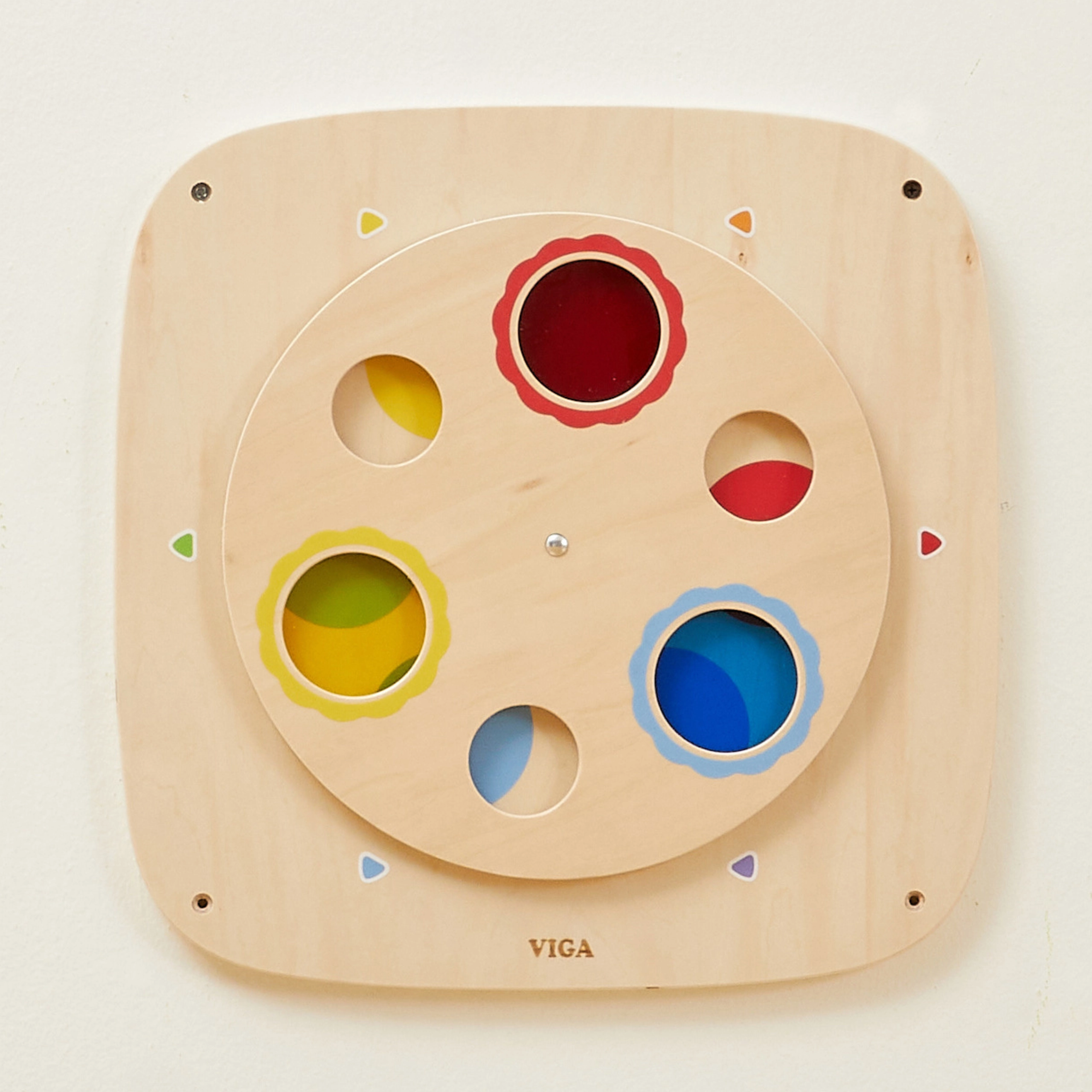 Táto kvalitná drevená nástenná tabuľa VIGA prináša hravou formou učenie teórie farieb. Otočný kruhový panel s priesvitnými farebnými okienkami umožňuje deťom porovnávať farby, vrstviť ich na seba a objavovať nové odtiene. Vďaka robustnému prevedeniu je tabuľa ideálna pre domácnosti, škôlky aj herné kútiky.