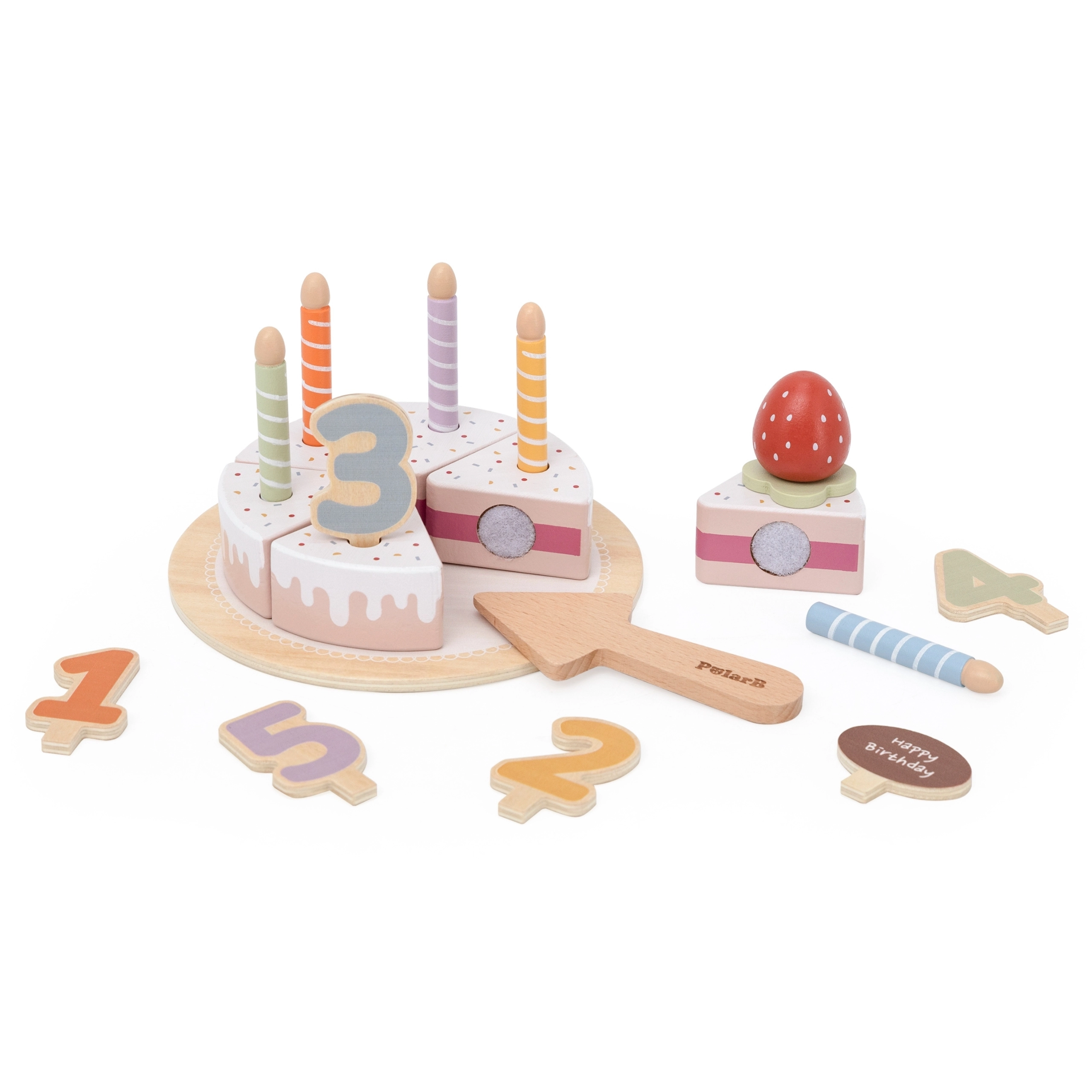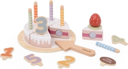 - Obsah setu: 6 dielikov torty, 5 drevených čísel, odnímateľné sviečky, jahodová dekorácia, tabuľka „Happy Birthday“, podnos a drevená špachtľa.