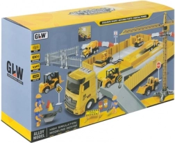 - Obsah setu: TIR s rozkladacou platformou, vežový žeriav, miešačka, cestný valec, vysokozdvižný vozík, pásový bager, nakladač, sklápač, 2 figúrky, kužele, bariéry, značky, sudy, pásky, fúrik a lopata.