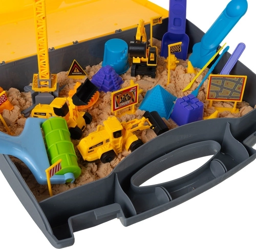 Praktické prenosné riešenie: otvorte kufrík a získate herný tác s priehradkami na piesok, vozidlá a nástroje. Jednoduché ukladanie a hra kdekoľvek.