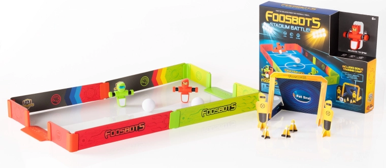 Zažite rýchlu a napínavú zábavu so setom robo futbalu FOOSBOTS od Fat Brain. Kompaktný stolový štadión s mantinelmi, 2 robotickými hráčmi a loptou dopĺňa tréningový set s terčom na presnú streľbu. Ideálny na head-to-head súboje, rýchle reflexy a rodinné turnaje kdekoľvek na stole.