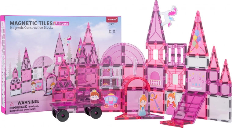 Objavte čarovnú magnetickú stavebnicu pre deti od 3 rokov – sada 58 dielov na stavbu ružového princeznovského zámku. Diely z odolného plastu sa spájajú pomocou silných neodýmových magnetov, takže vytvárajú stabilné 3D konštrukcie. Súčasťou sú tiež postavičky princa, princezien, jednorožca a zajačika aj podvozok s kolieskami pre vozidlá. Skvelá hračka, ktorá rozvíja kreativitu, trpezlivosť a sústredenie.