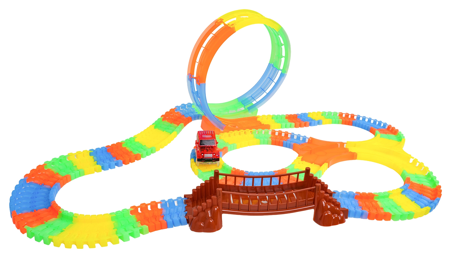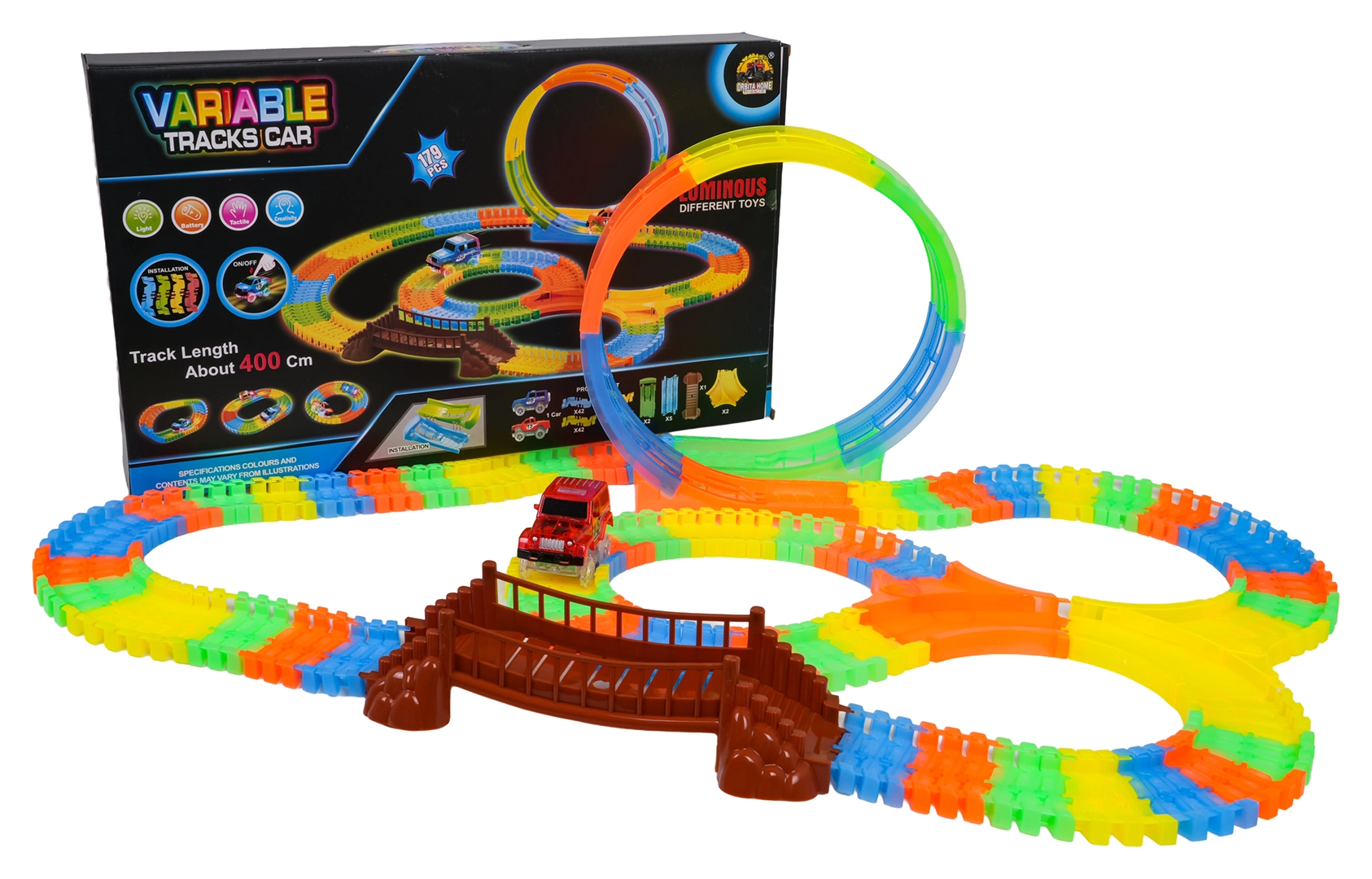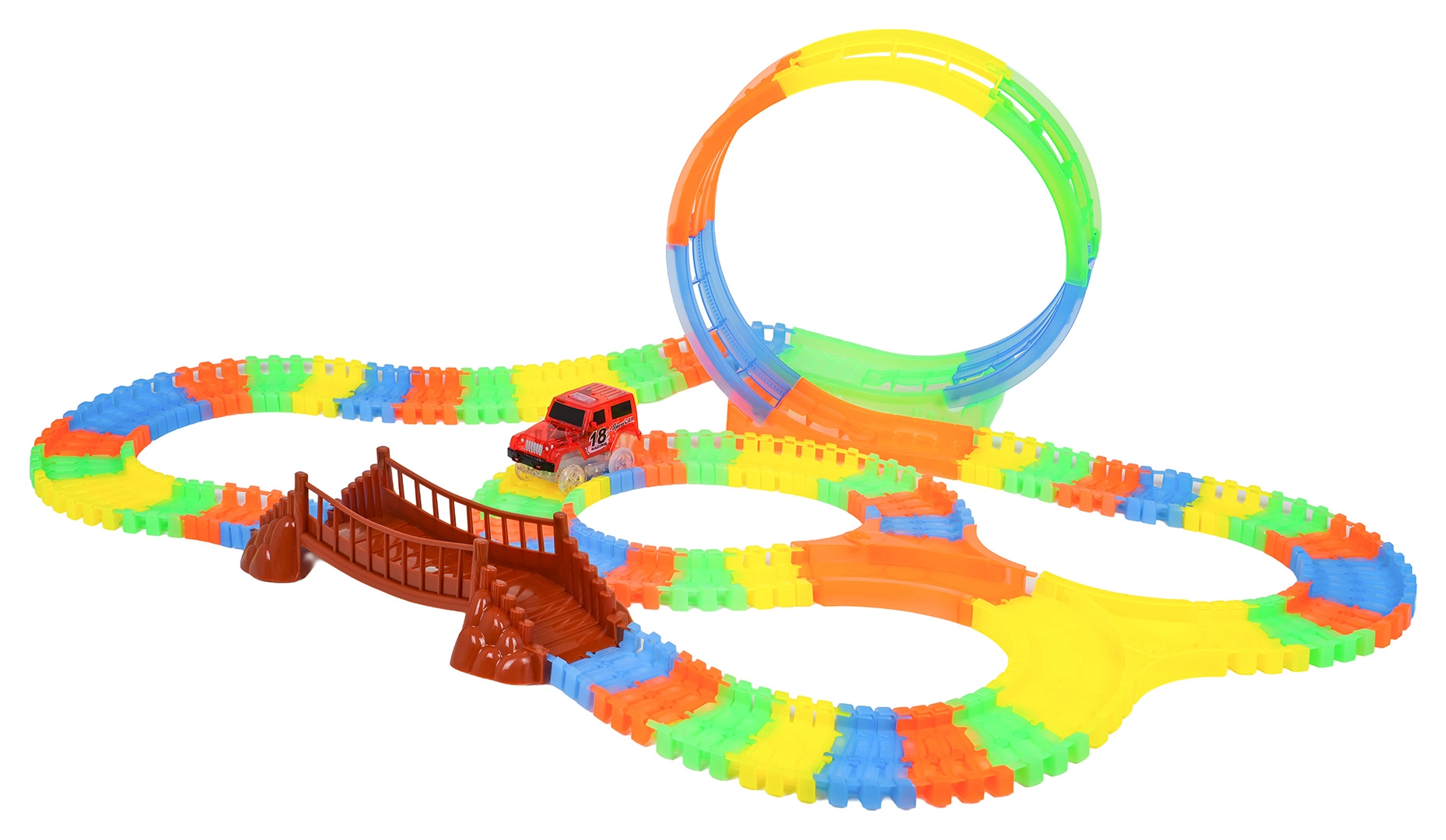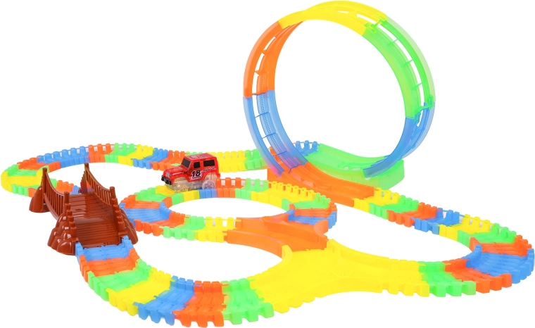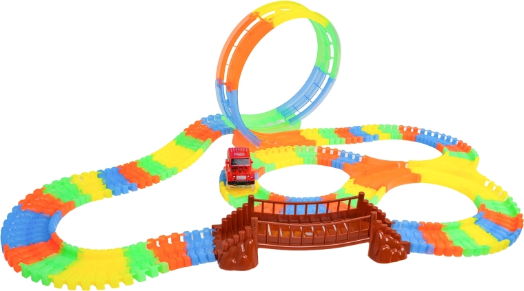Táto farebná autodráha poteší deti už od 3 rokov. Vďaka flexibilným segmentom si postavíte rovinky, zákruty, most aj veľkú zvislú slučku – a to behom chvíľky. Fluorescenčné prevedenie zaistí efekt žiarenia v tme, zatiaľ čo LED autíčko prechádza traťou a zanecháva svetelnú stopu.