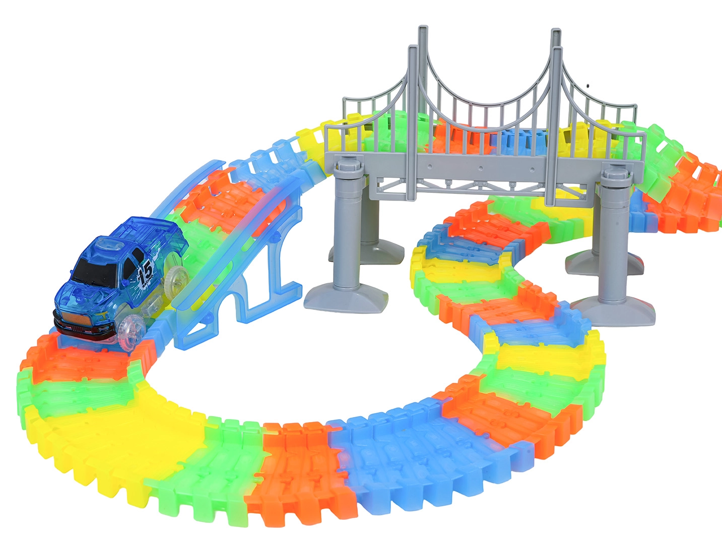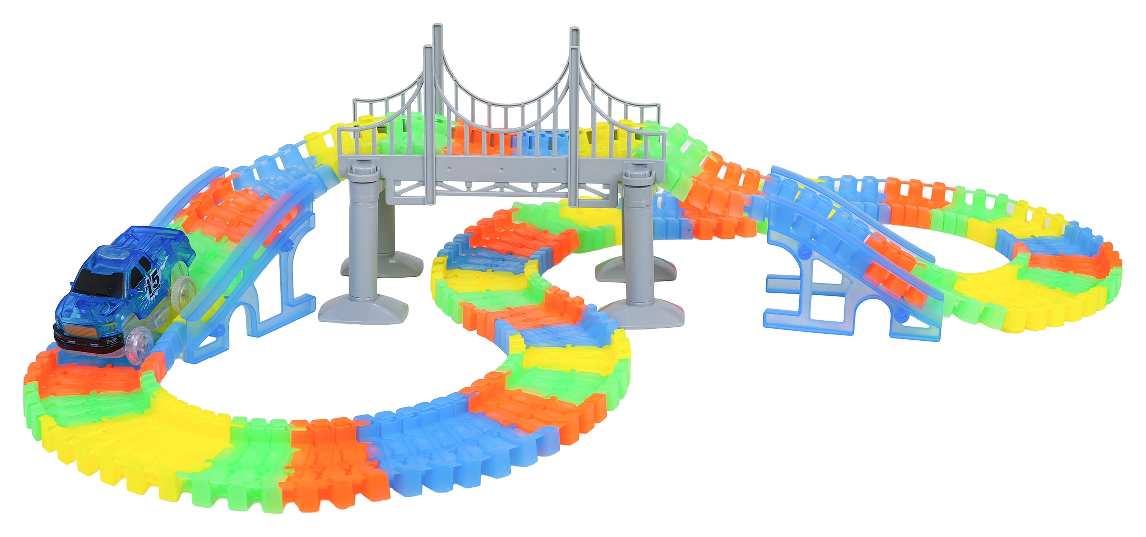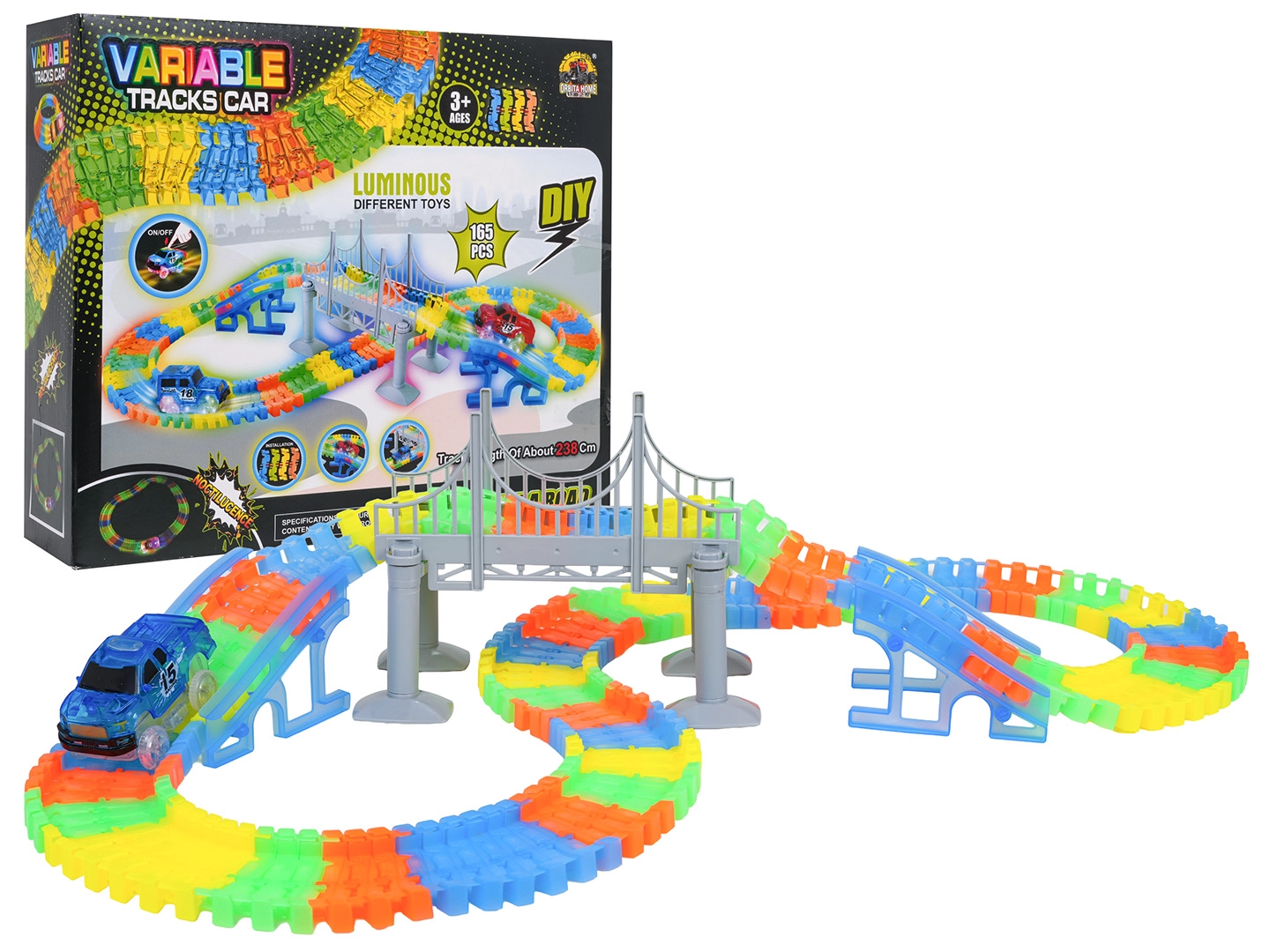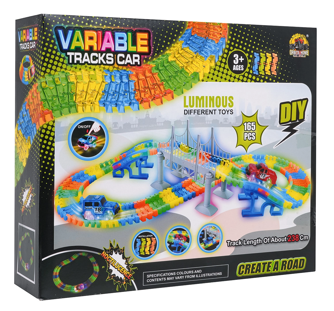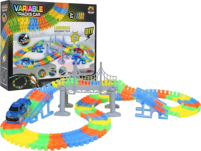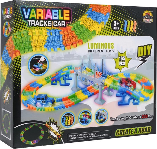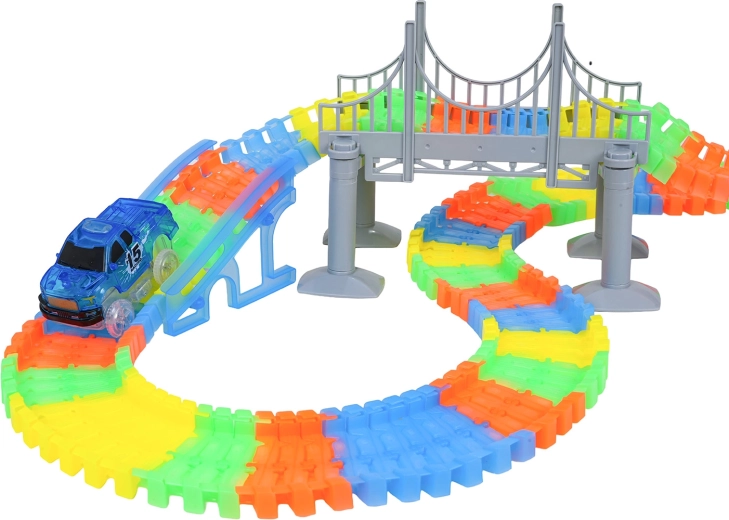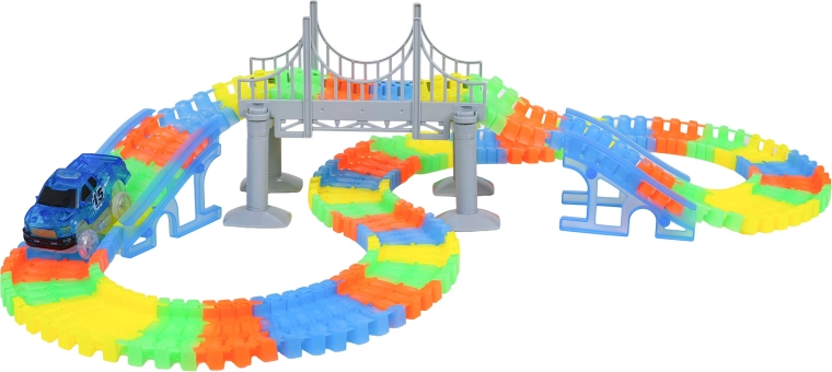 Táto kreatívna pretekárska dráha ponúka deťom od 3 rokov hodiny nápaditej hry. Diely sa do seba ľahko zaklapávajú, trať je ohýbateľná a otočná, takže si môžete vytvárať mosty, rampy aj odvážne zákruty. Fluorescenčné prevedenie koľají rozžiari izbu po zhasnutí svetiel.